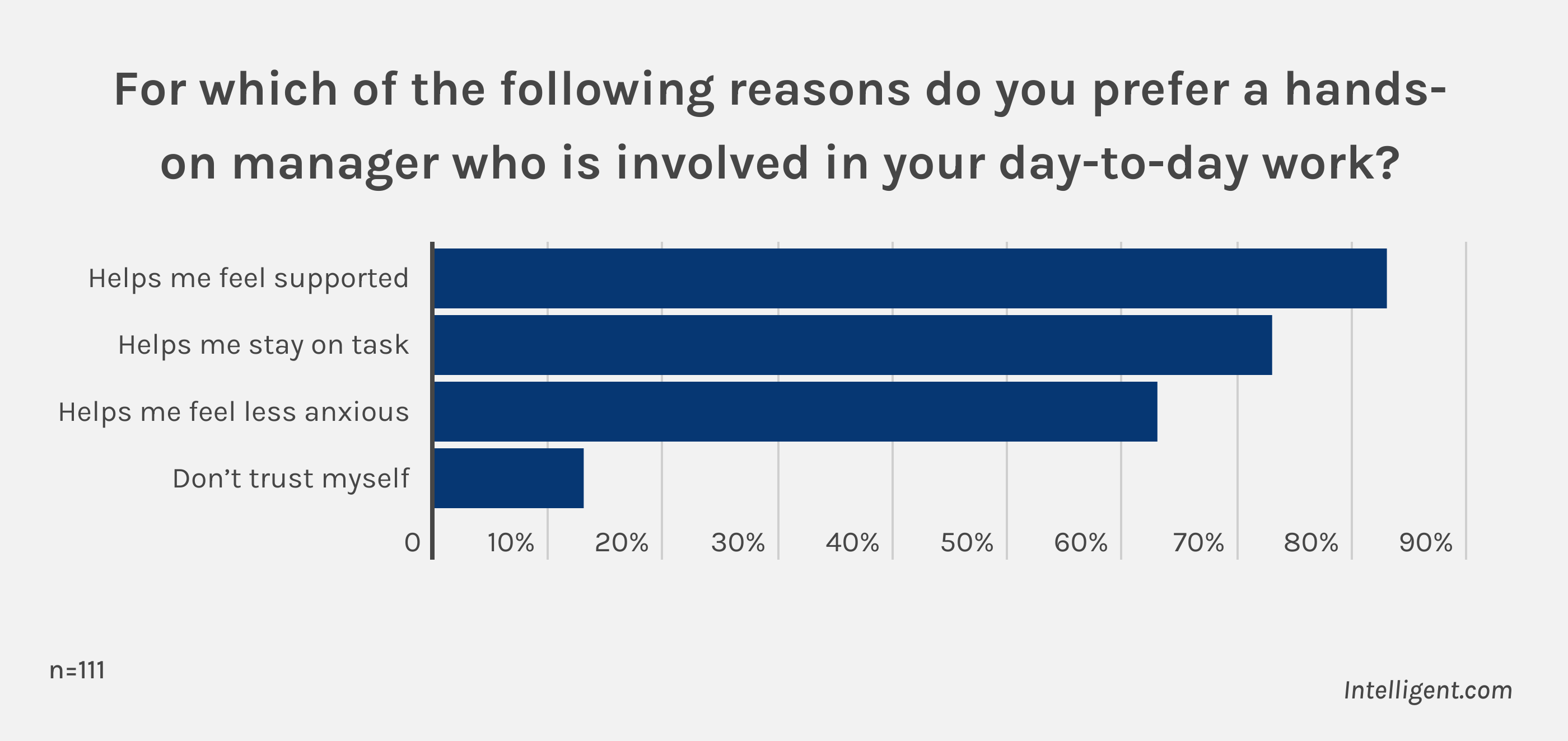 Among those who say they want a hands-on management approach, 83% say this style helps them feel more supported at work, 73% say it helps them stay on task, 63% say it helps them feel less anxious, and 13% say they don’t trust themselves to do a good job on their own.