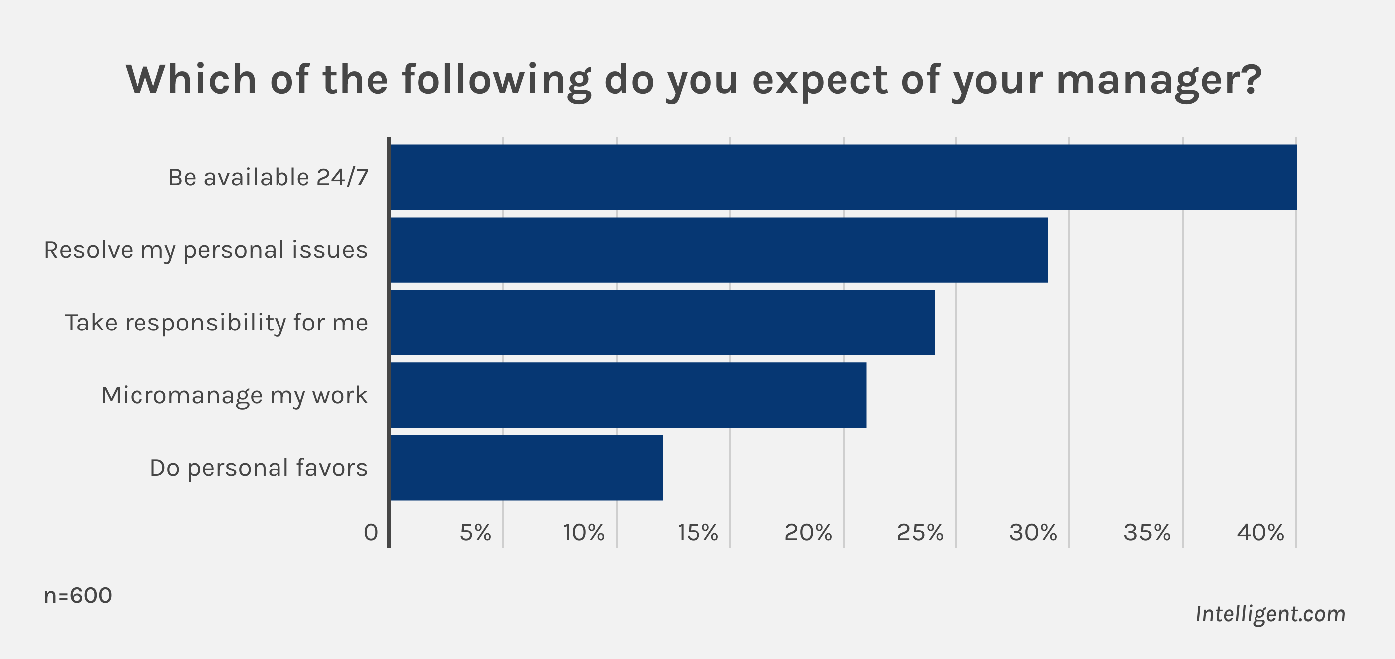 Many employees in this age group seem to feel especially attached to their managers, as 40% say they expect their managers to be available 24/7 for any inquiries or issues. Additionally, 29% expect their managers to resolve all personal issues affecting their work, and 24% expect their managers to take responsibility for respondents’ shortcomings.