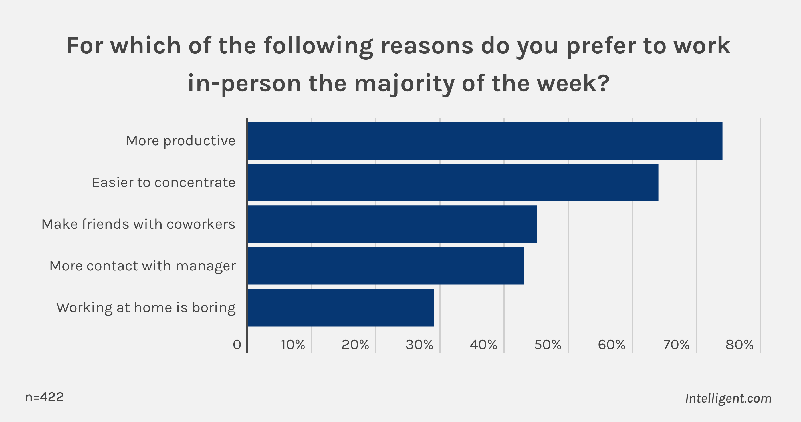 For those who want to work in person most of the week, the top reasons why include that it makes them more productive (74%), it’s easier to concentrate (64%), to make friends with coworkers (45%), and to have more contact with their manager (43%).