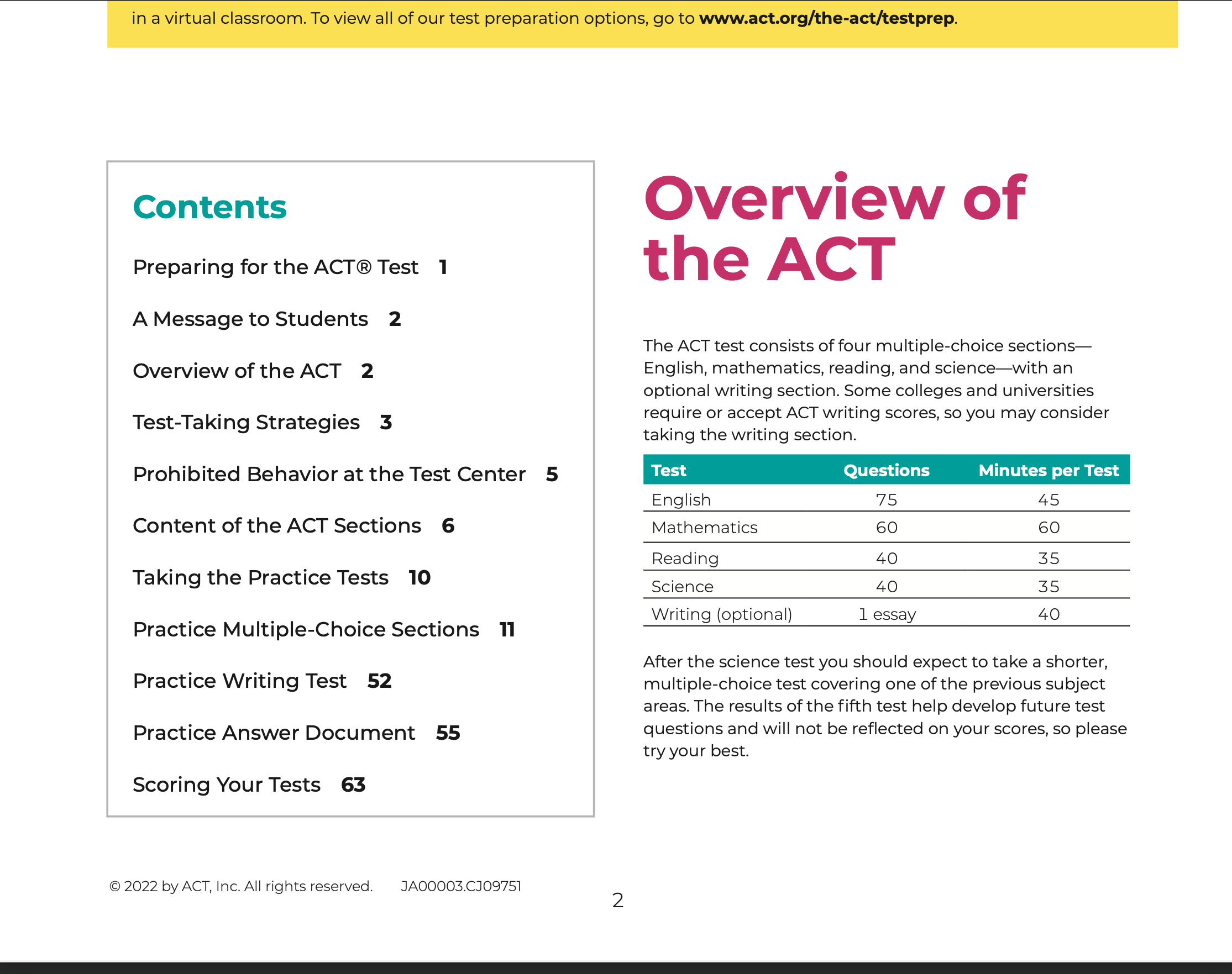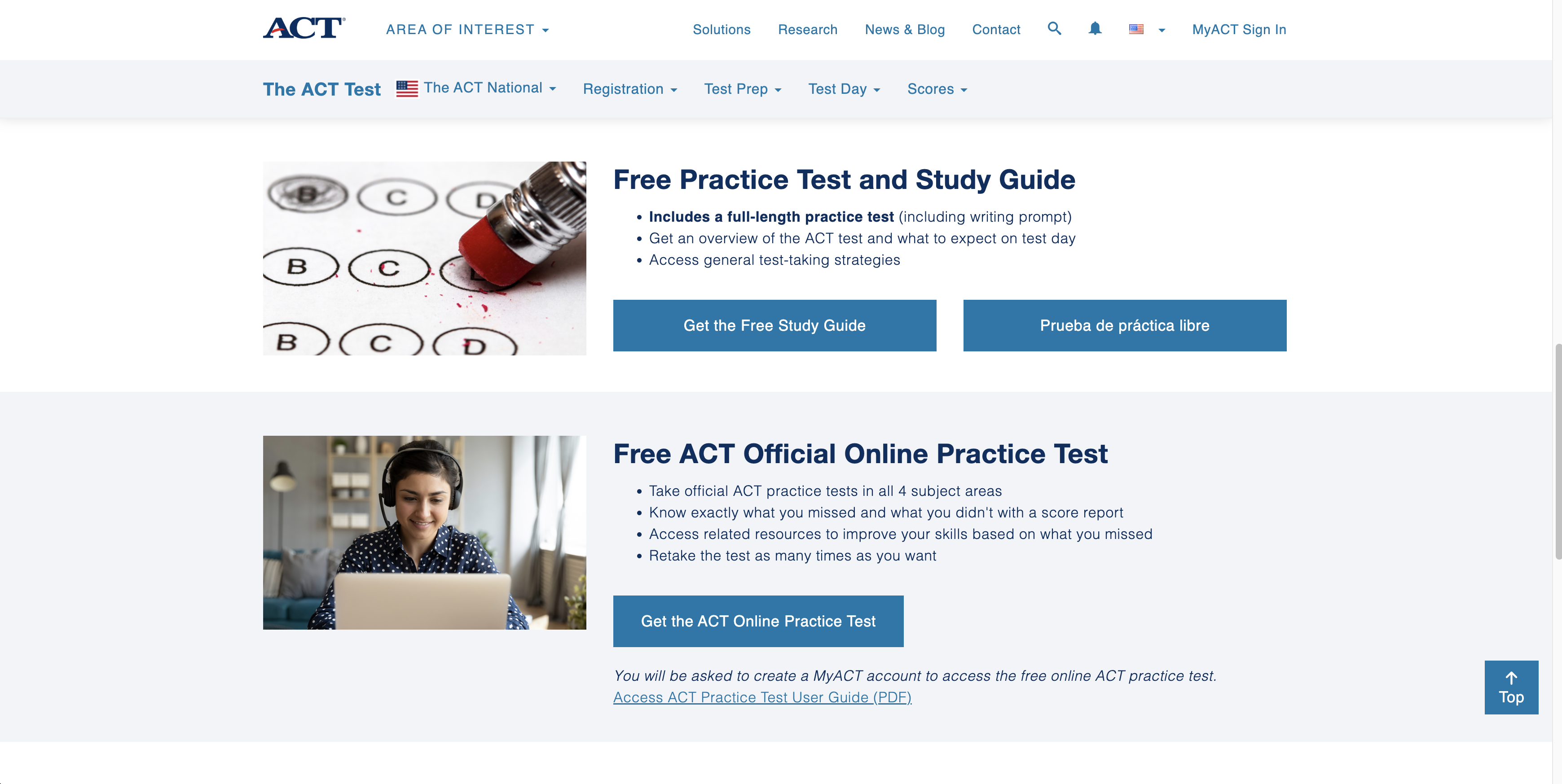 By simply signing onto the ACT website, students can access a variety of test prep materials, including an official ACT practice exam and the official ACT Study Guide. Students who take the official practice exam online can see how they did with a score report that breaks down where students need improvement. The downloadable Study Guide includes: