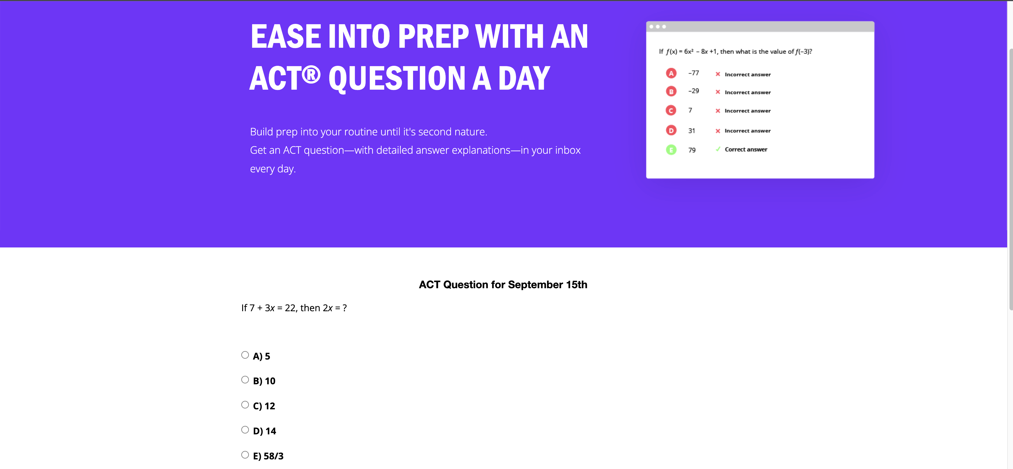 Additional prep materials, like quizzes, video lessons, and more practice exams, are provided by Kaplan. ACT and Kaplan also partner to offer free lessons, available on-demand or live online. Kaplan instructors teach the courses, which customers can also access as trial lessons. In addition, there’s a fun “Question of the Day” feature where students get an ACT question delivered daily via email.