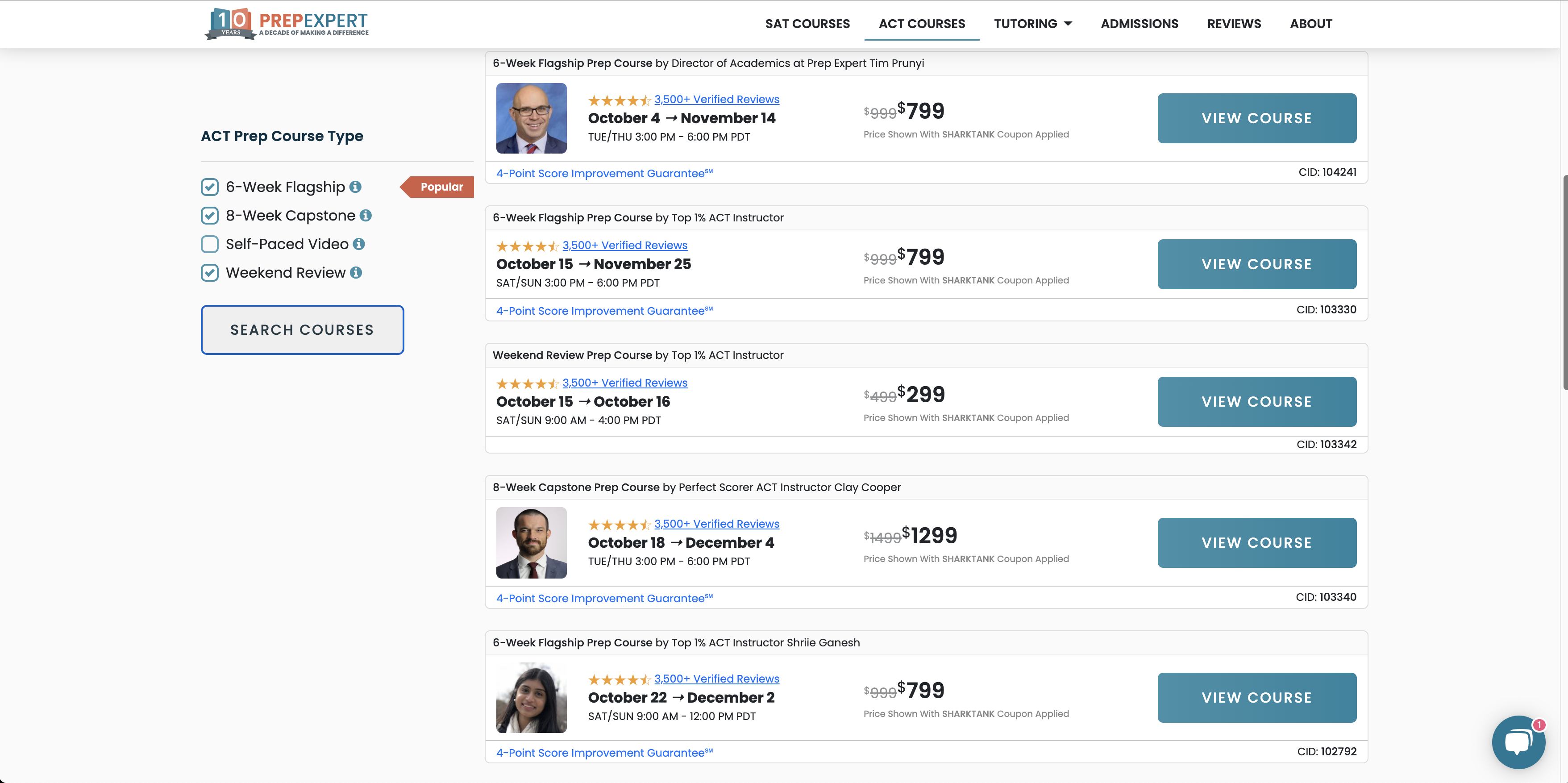 Prep Expert made a splash when founder Dr. Shaan Patel appeared on the show “Shark Tank” and won the backing of investor Mark Cuban. Since then, Prep Expert has expanded to offer a variety of courses covering the SAT and ACT, including live online classes, a self-guided program, and an intensive weekend review course. For students with a limited amount of preparation time or who want an intensive review before the ACT, we recommend Prep Expert’s Weekend Review course.