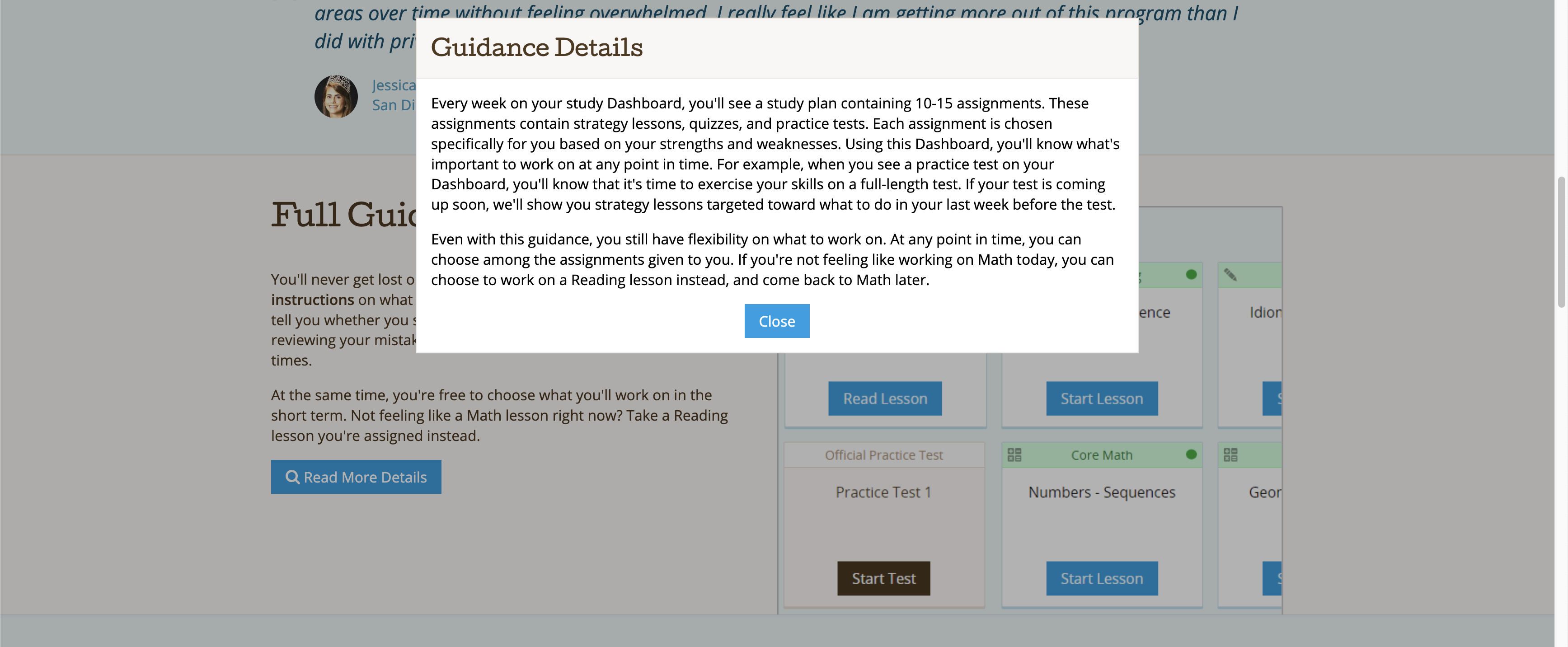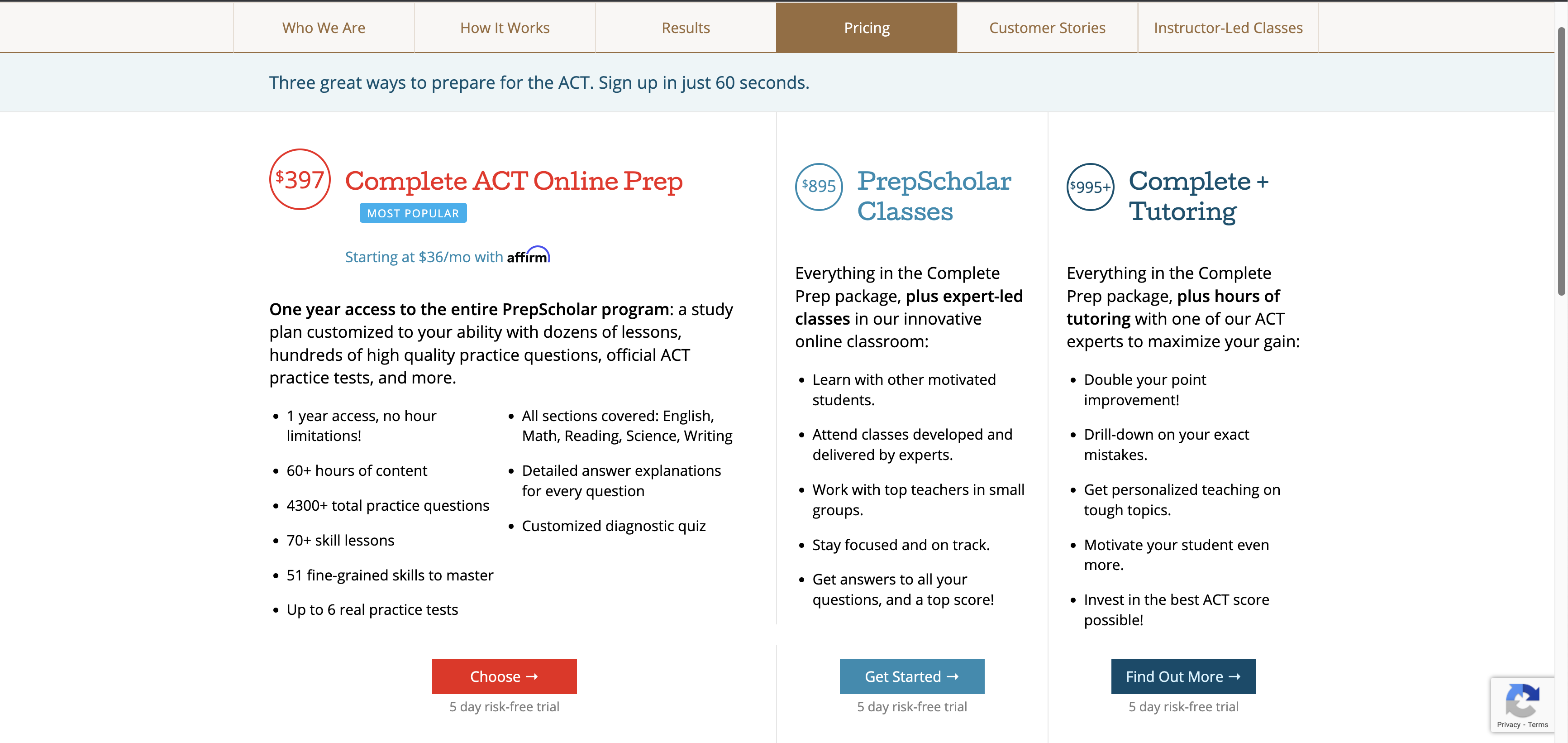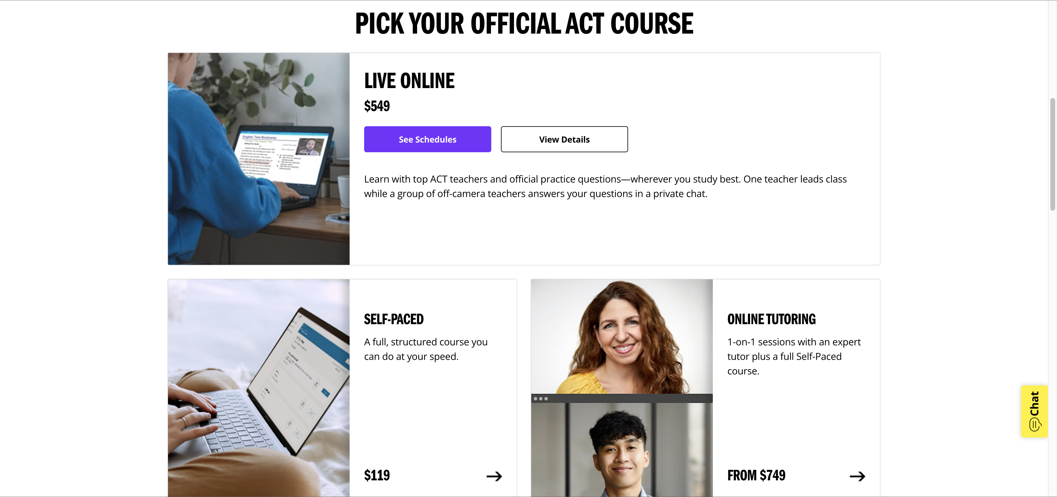 Even the most confident student may need a little extra help sometimes. To access individual tutoring, students must choose the 1-on-1 Online Tutoring + Complete Online ACT Prep package, which is more than double the cost of the Complete Online ACT Prep course.