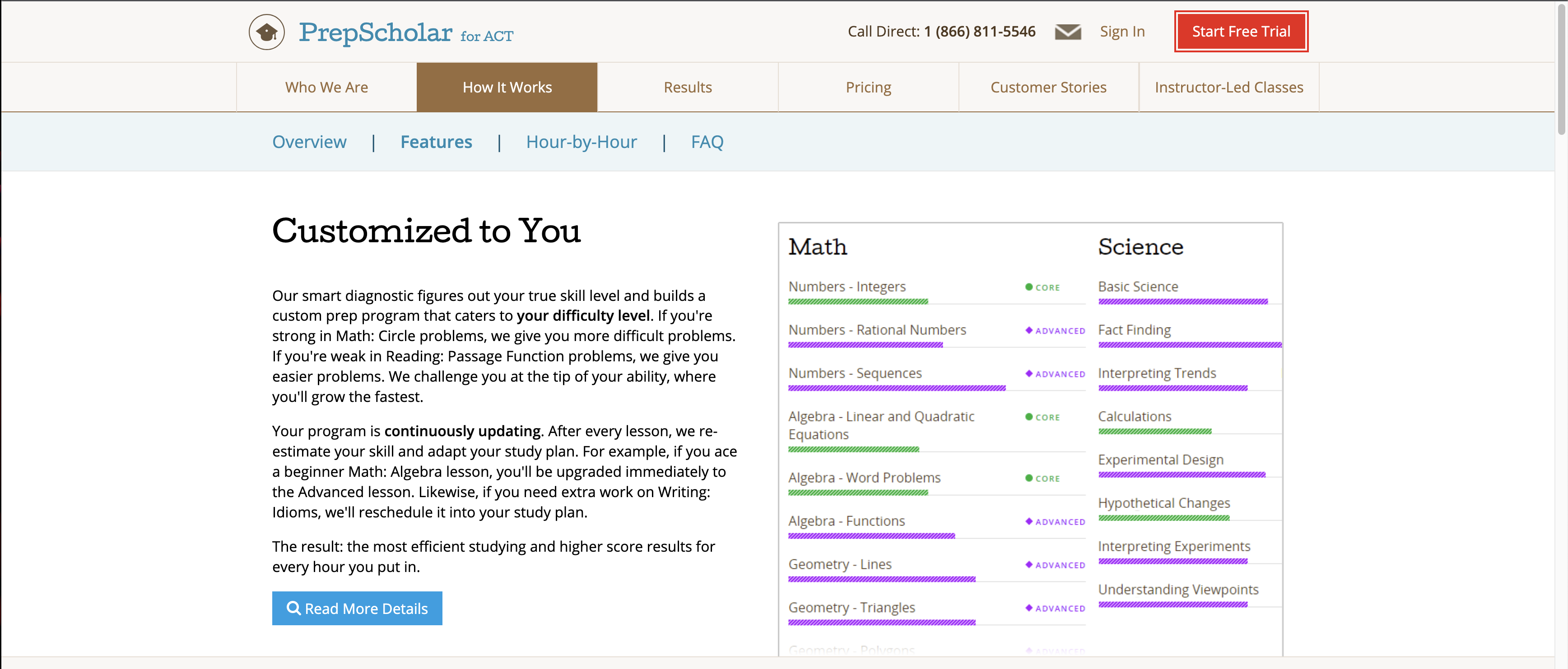 PrepScholar’s Complete Online ACT Prep course avoids this pitfall by using algorithms to analyze students’ progress and customize lessons based on what subjects and skills students need to improve.