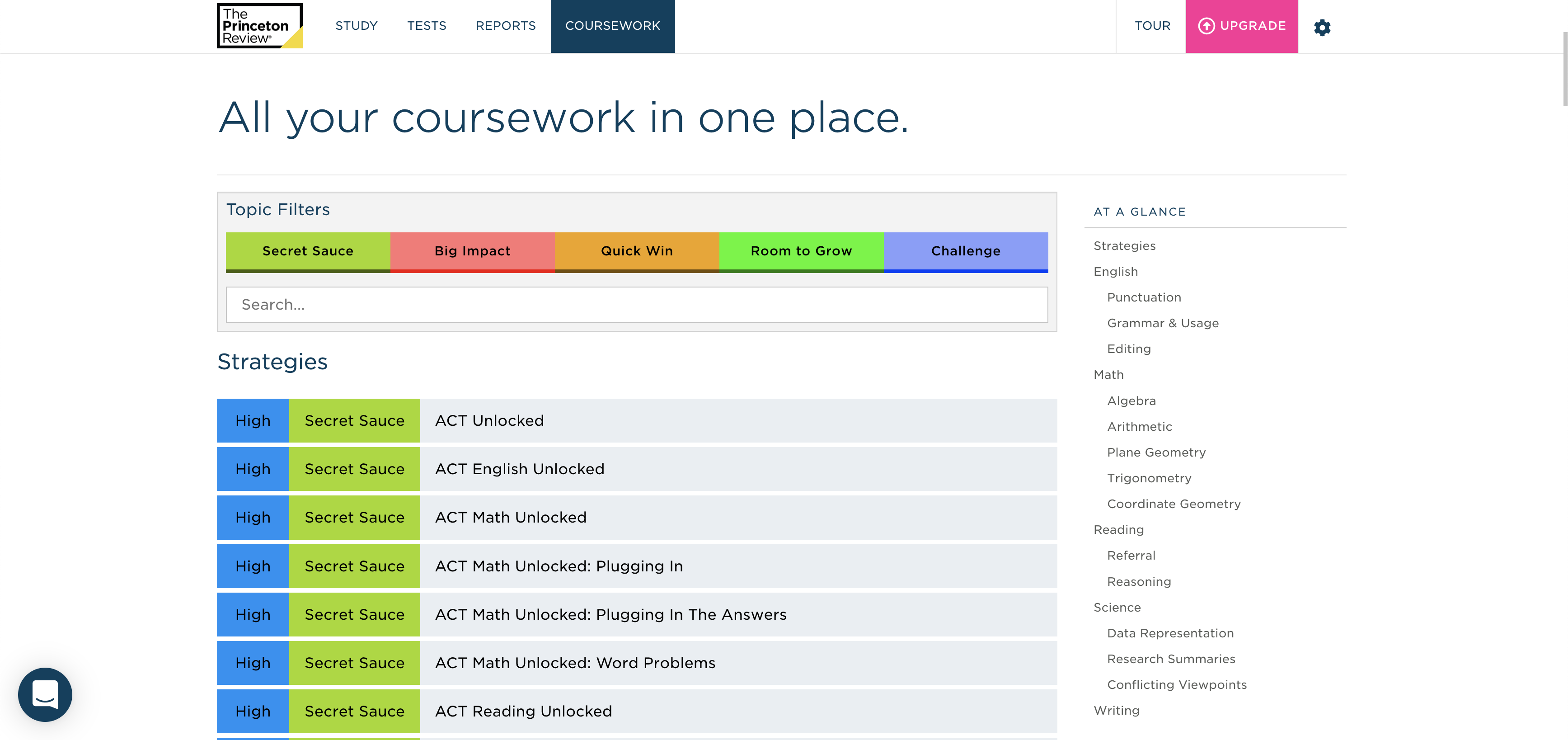 PrepScholar started as an SAT prep program in 2013. Since then, PrepScholar’s founders, Harvard alum Allen Chang and Fred Zhang, further developed their adaptive algorithms to help students study for the ACT. PrepScholar offers three types of ACT prep — an on-demand course, virtual classes, and 1:1 tutoring. Based on our evaluation, PrepScholar’s Complete Online ACT Prep course is a stand-out for busy students who want an asynchronous, fully online program.