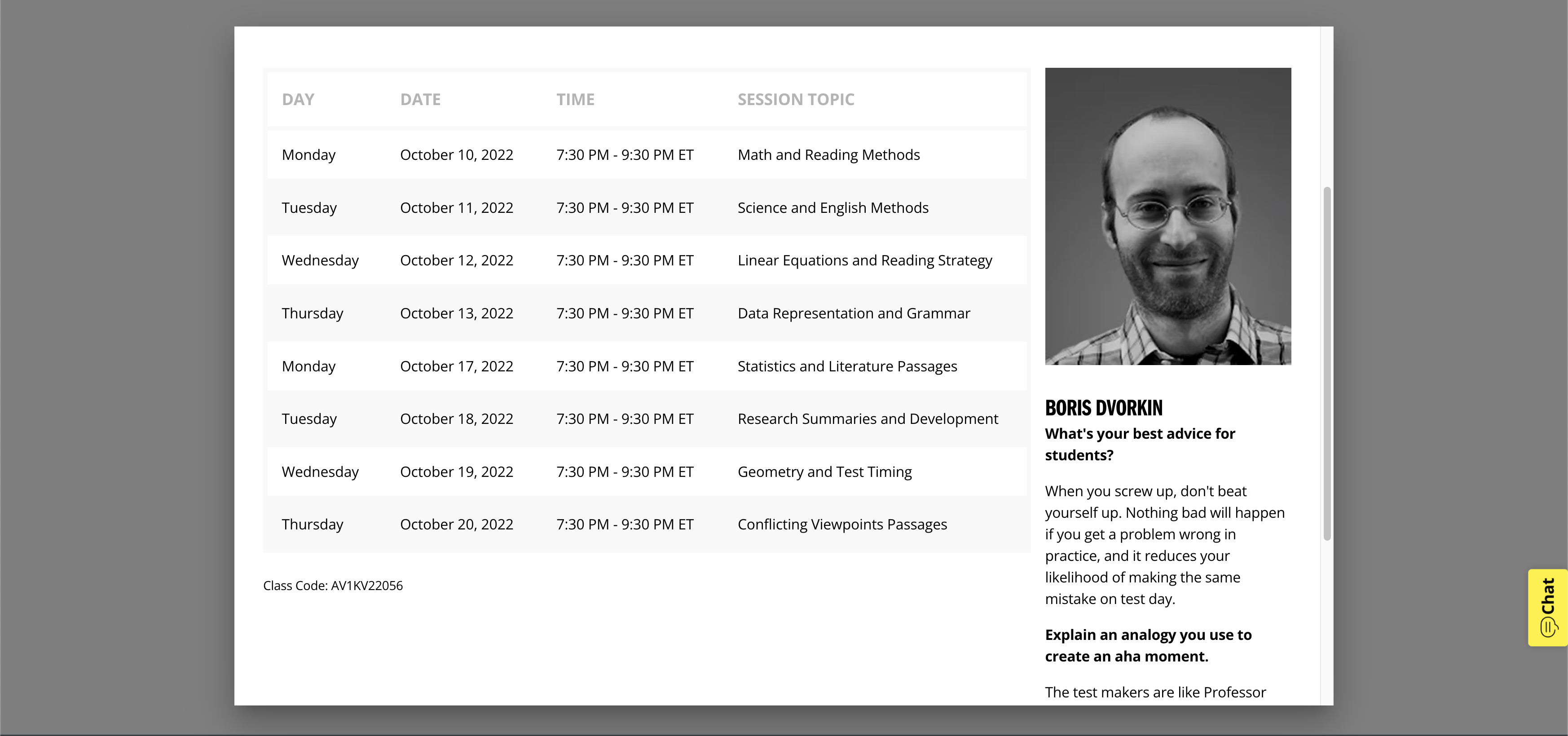 Classes are highly interactive, with students and instructors communicating via a microphone, chat box, and whiteboard. Instructors are also available outside regularly scheduled class hours to answer questions and provide assistance. At the end of each session, instructors assign homework based on students’ progress. Students also complete 10-15 practice exams throughout the course, helping them familiarize themselves with the content and structure of the ACT.