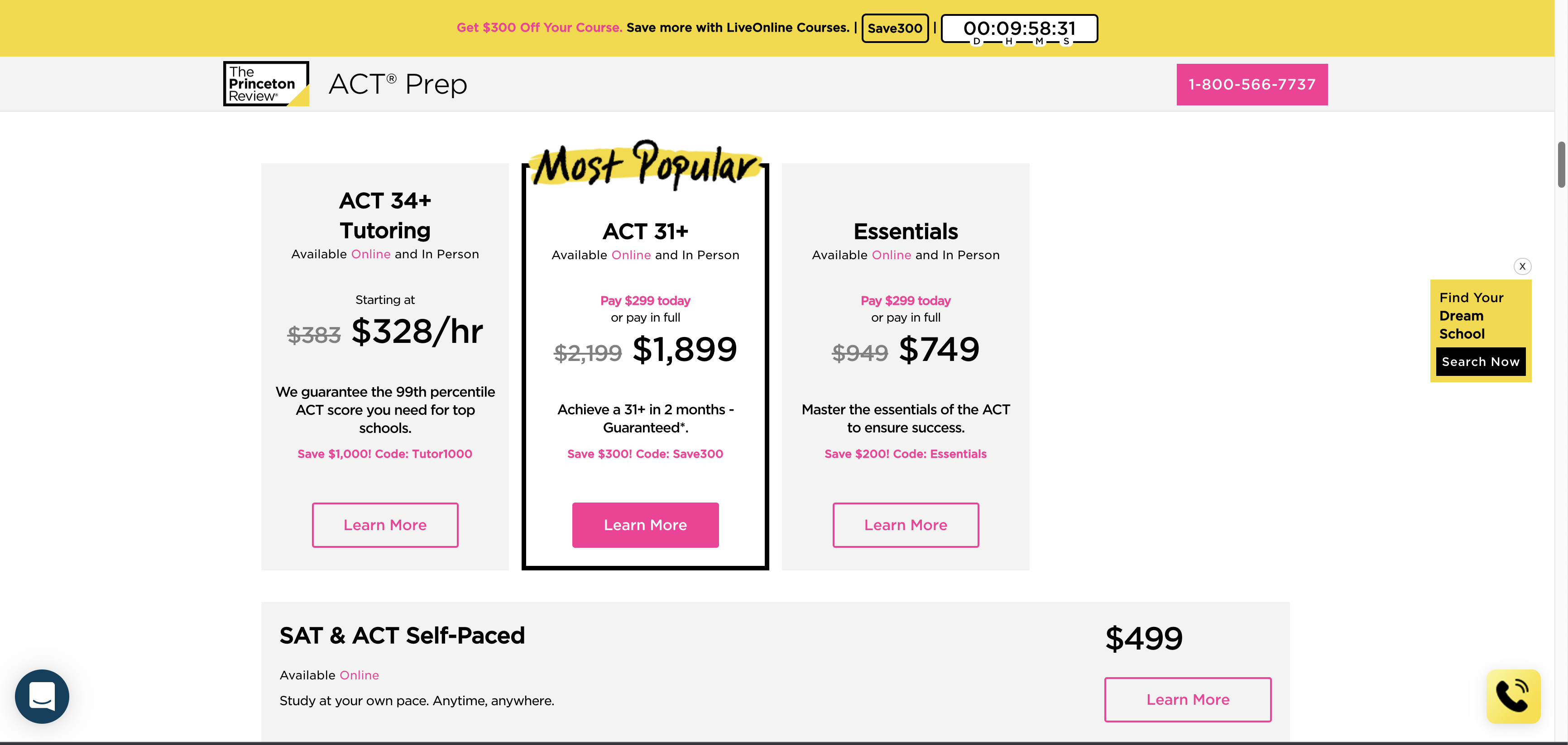 The Princeton Review’s biggest strength is that they have something for everyone. Students who need flexibility can choose TPR’s on-demand Self-Paced program (which includes SAT prep materials). For those who learn better in a classroom, there’s the Essentials program, which offers both virtual and in-person classes. There’s the ACT 31+ course for students seeking to be among the ACT’s highest scorers, as well as several 1:1 tutoring packages.