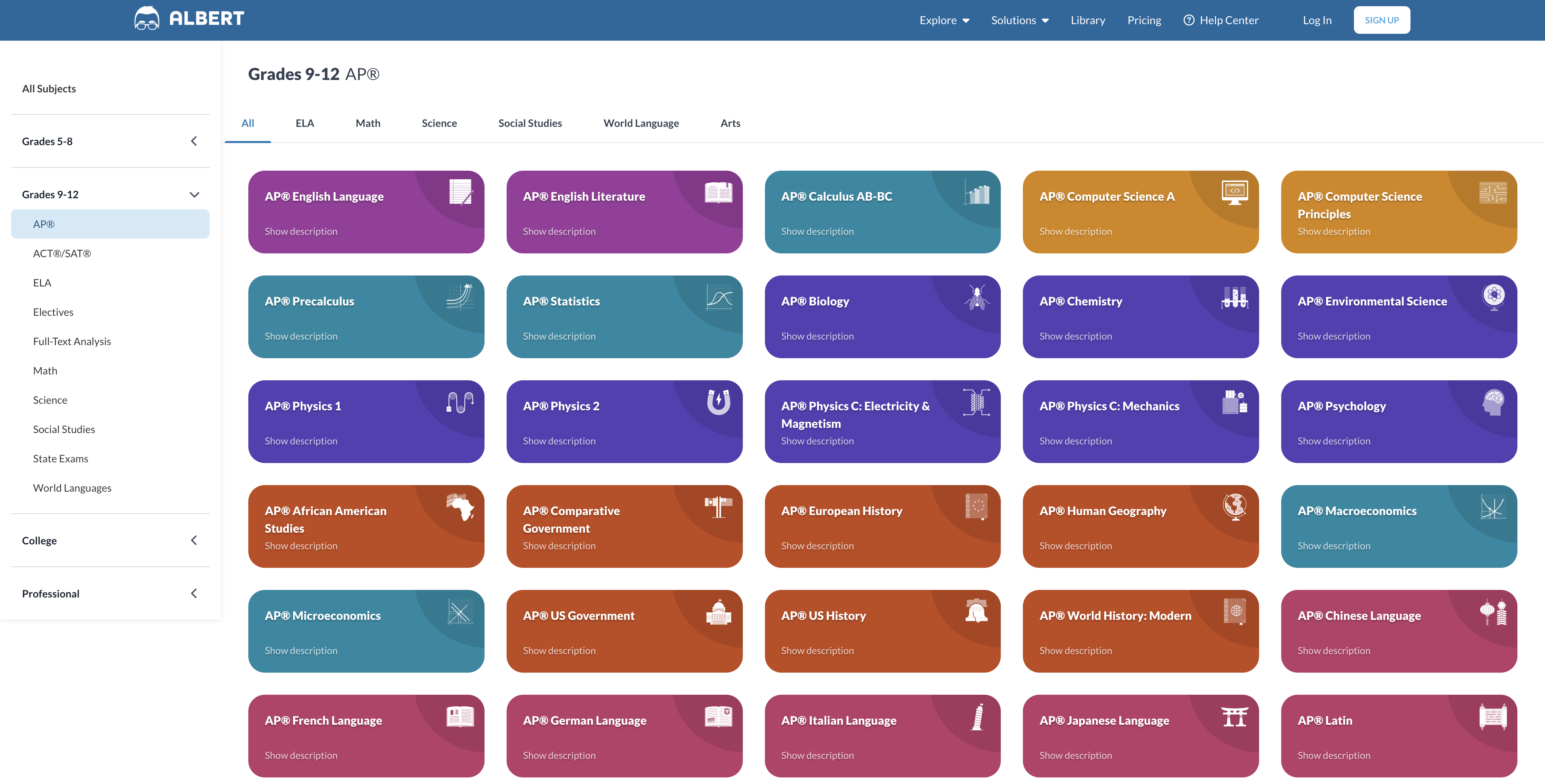 Albert offers a robust library of AP review courses — including everything from English Literature to Microeconomics to Environmental Science and beyond.