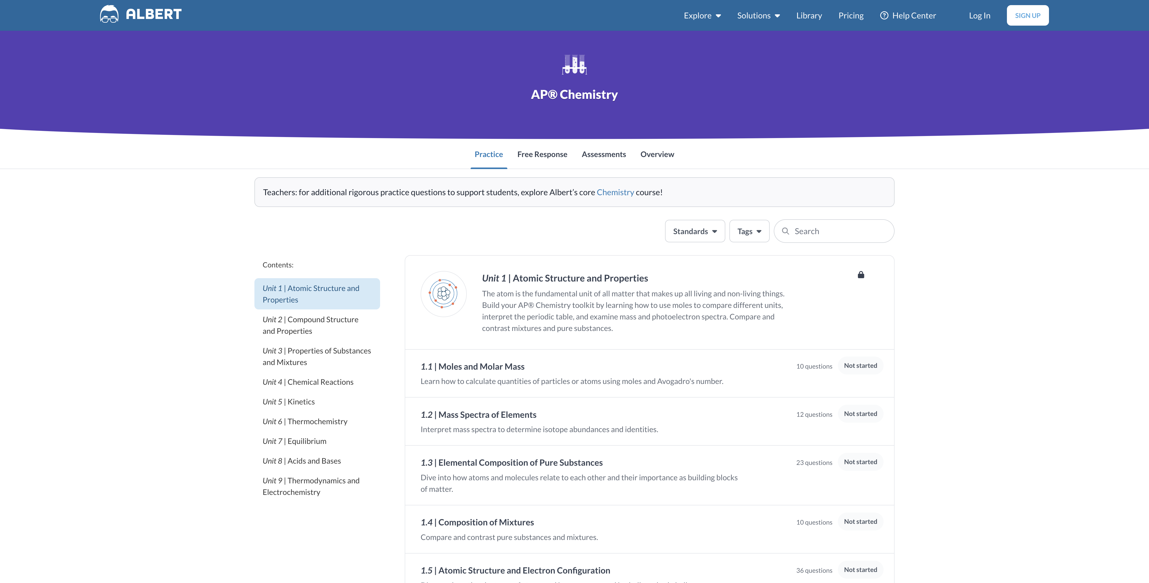 Albert’s AP Chemistry course offers a simple interface that’s easy to navigate and designed to correspond neatly with the exam’s content.