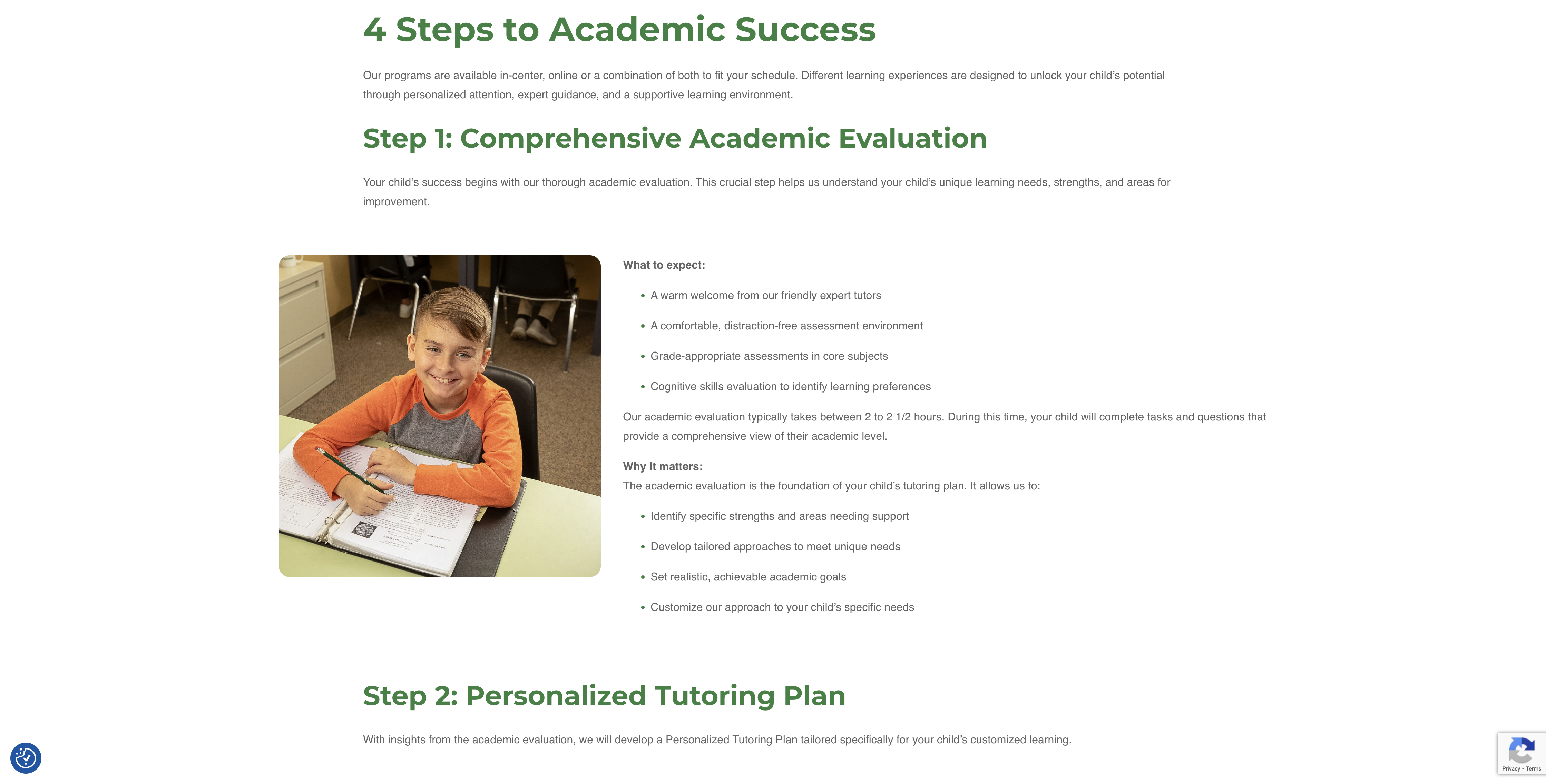 The program offers a four-step path to academic success, including an academic evaluation, a personalized tutoring plan, customized learning, and ongoing feedback and support.