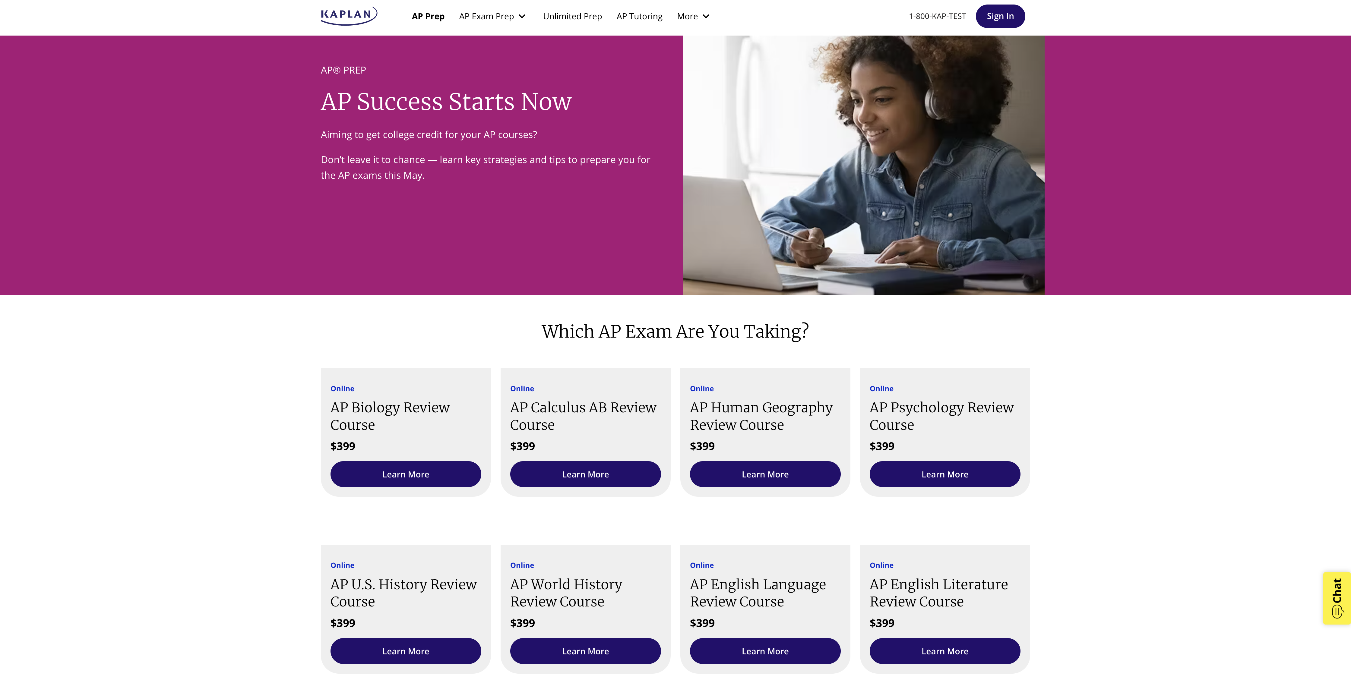 Kaplan offers eight individual AP review courses, including biology, psychology, and U.S. history options.