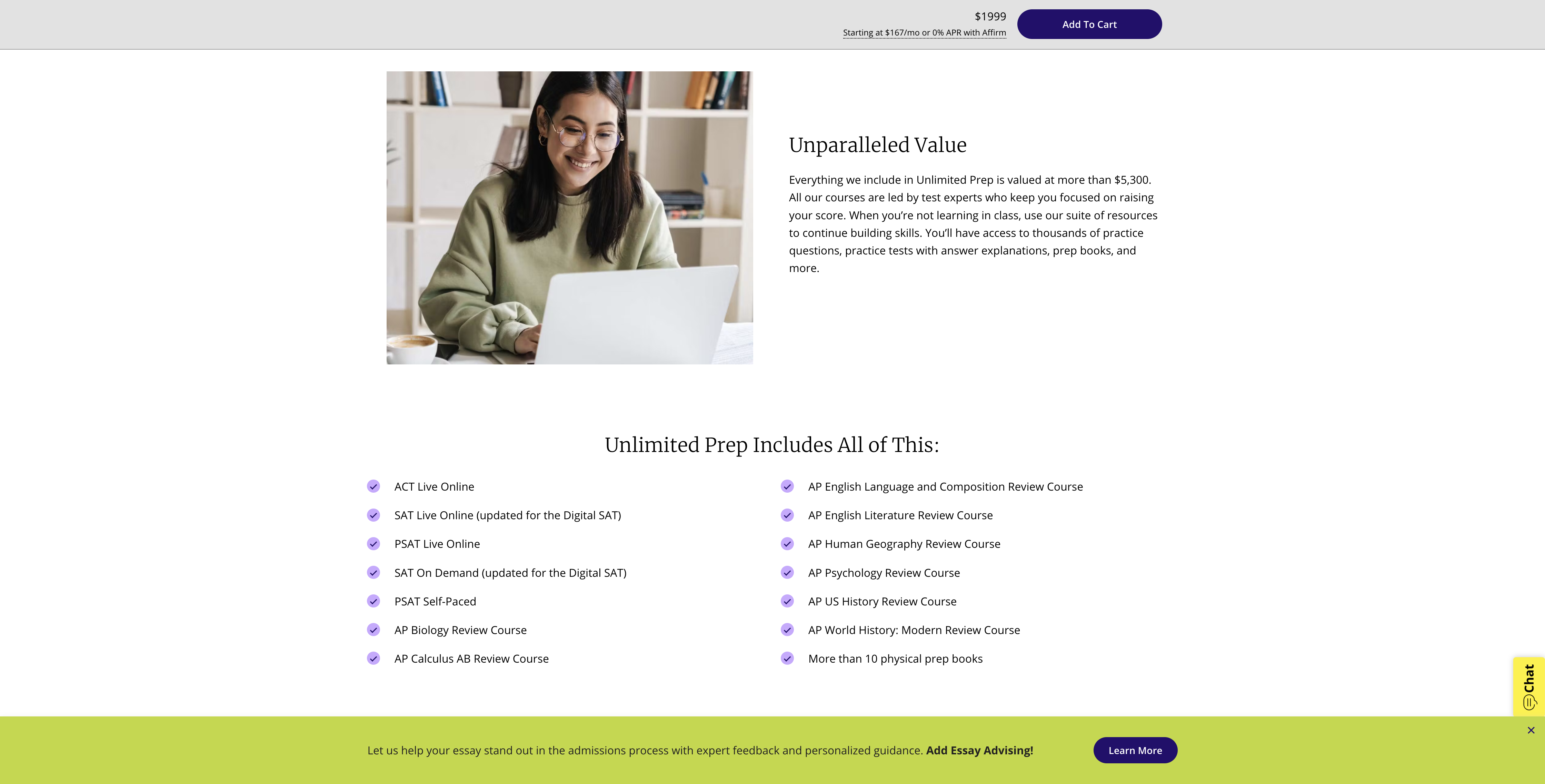 Kaplan’s Unlimited Prep option provides students with access to all of the platform’s AP review courses, plus SAT and ACT prep, in a single package. This option is ideal for preparing for multiple AP exams or tackling college entrance exams, offering substantial value and comprehensive coverage across subjects.