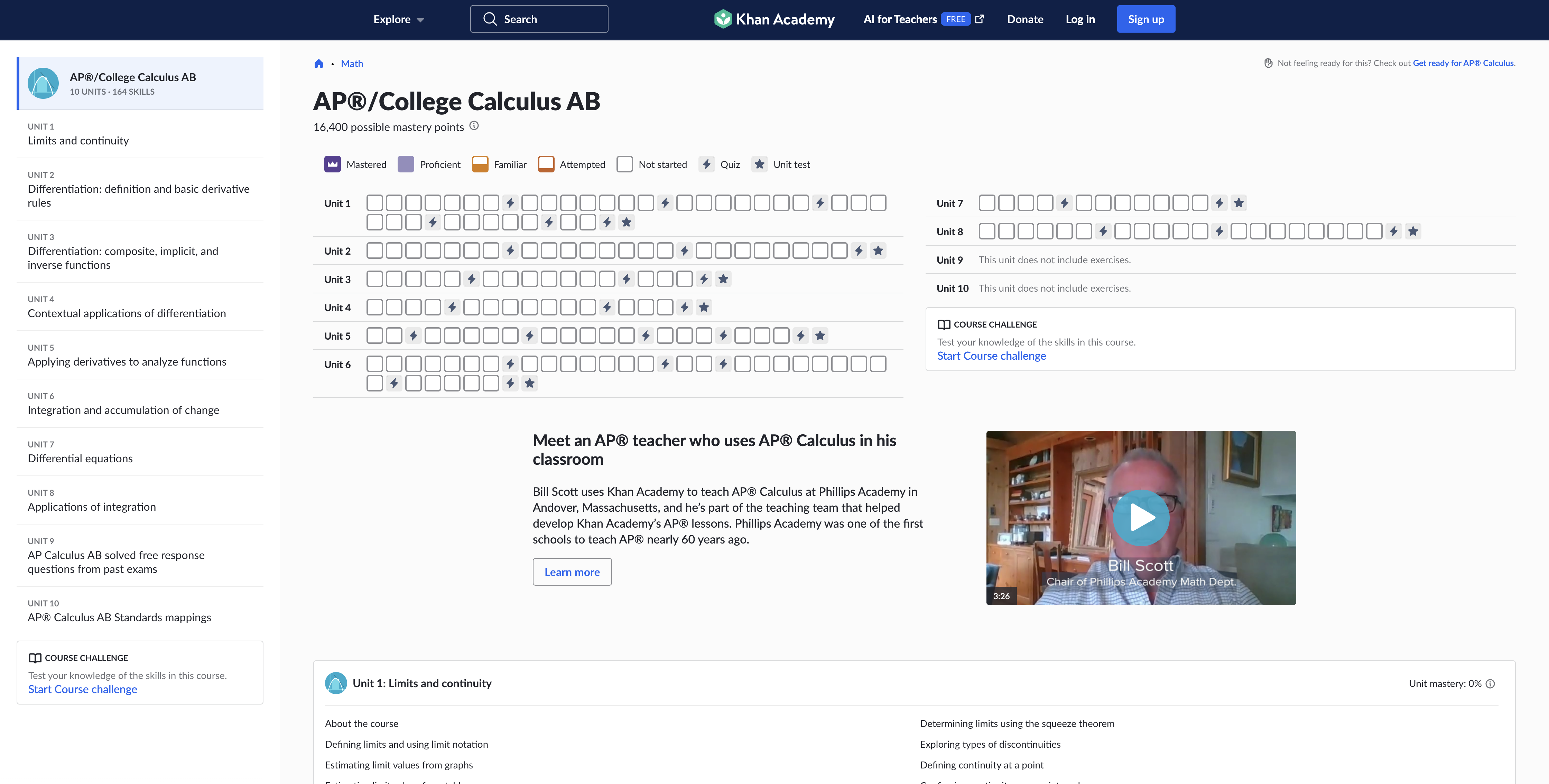 Some of Khan Academy’s courses, like this one on AP Calculus AB, offer a handy, easy-to-decipher progress tracker.