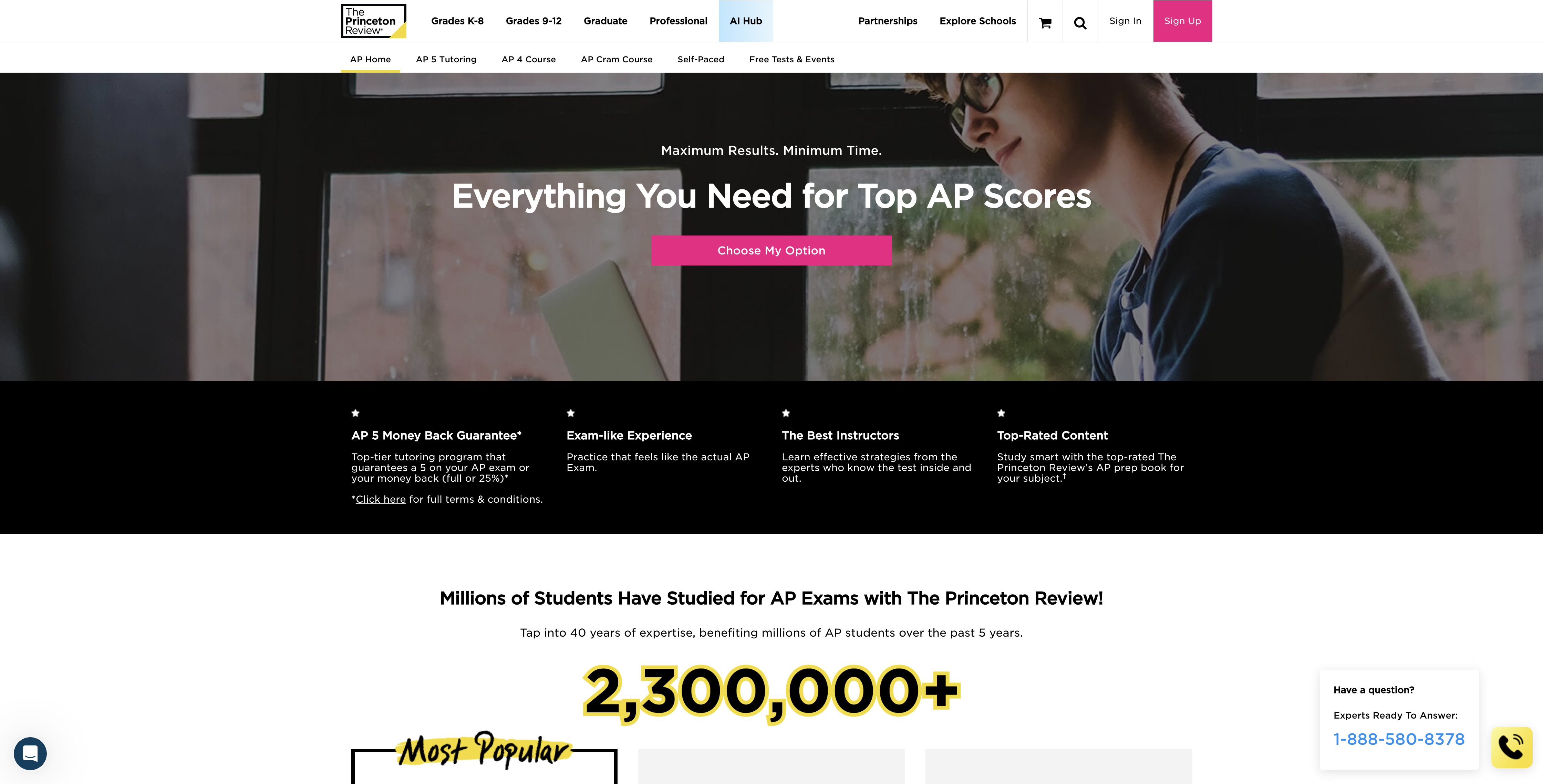 The Princeton Review is our top pick for AP test prep, offering the broadest range of options, including tutoring, live online courses, self-paced study, and impressive score guarantees. Though pricier, it may be a worthwhile investment if you’ve got your eye on top-tier results. The program features access to expert tutors, an interactive score report to monitor progress, and a top-rated AP prep book, all designed to enhance your preparation and success.