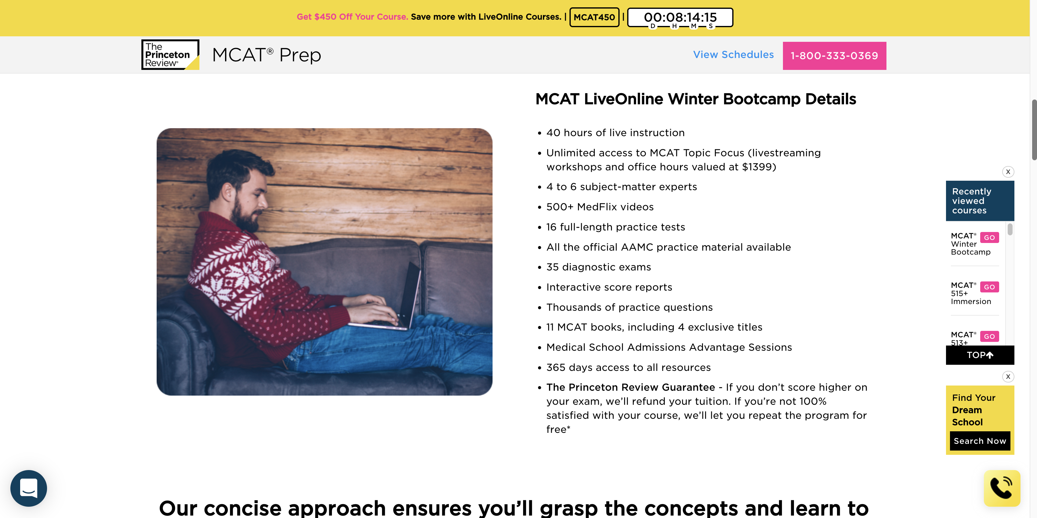 Kaplan’s MCAT test prep program is an excellent option for its versatility and flexibility, offering options that cater to every learning style and schedule. Whether you prefer self-paced study, thrive in live, interactive lectures, or benefit from personalized one-on-one tutoring, Kaplan has a solution. Some courses come with a “Higher Score Guarantee,” which promises to elevate your score to 515 or higher or increase your score by 15 points.