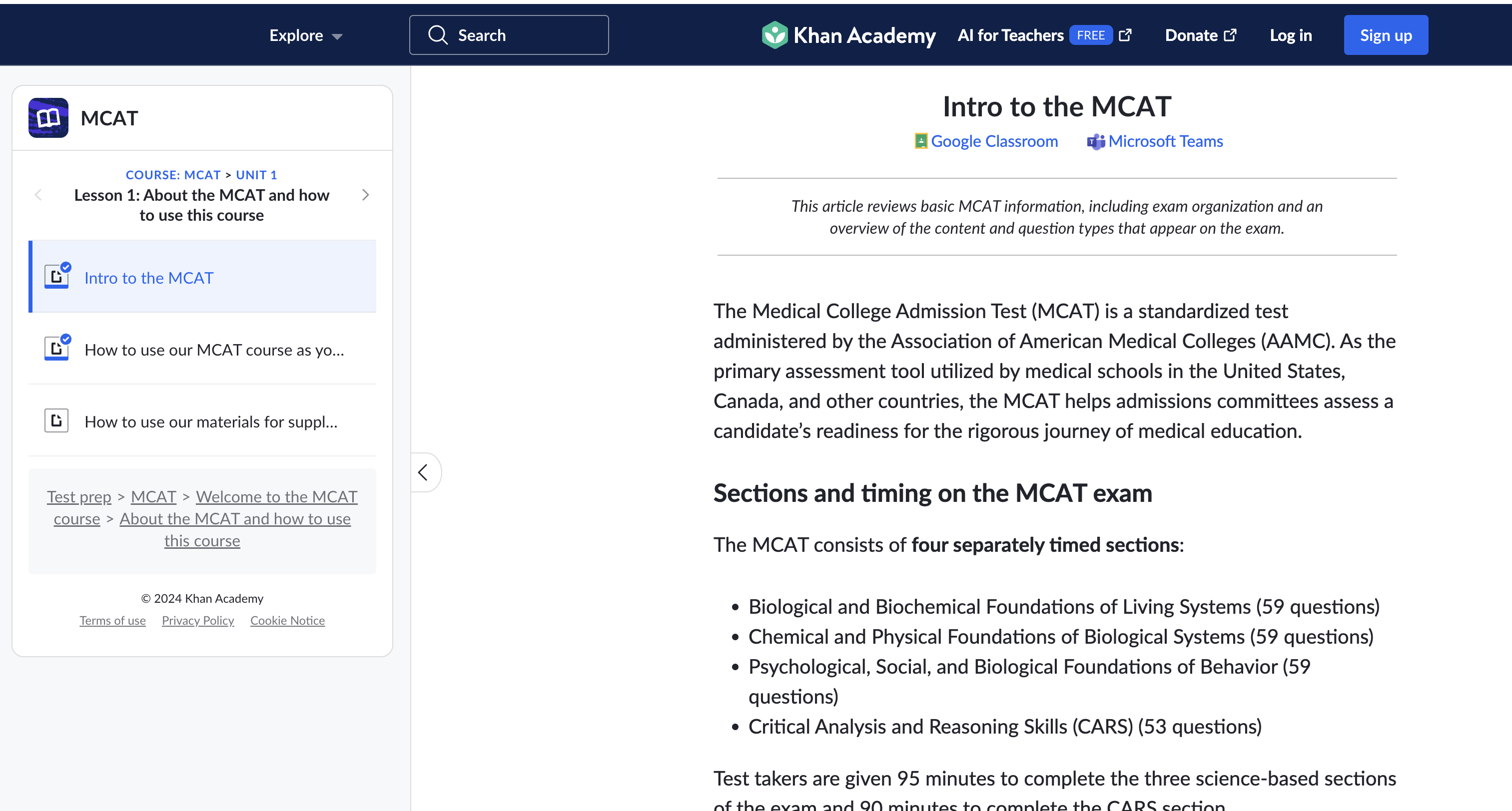 Khan Academy is an excellent MCAT prep resource for its accessibility and comprehensive content — all completely free of charge. As one of the few no-cost options, it removes financial barriers, making it an excellent choice for students who may not have the budget for premium test prep services.