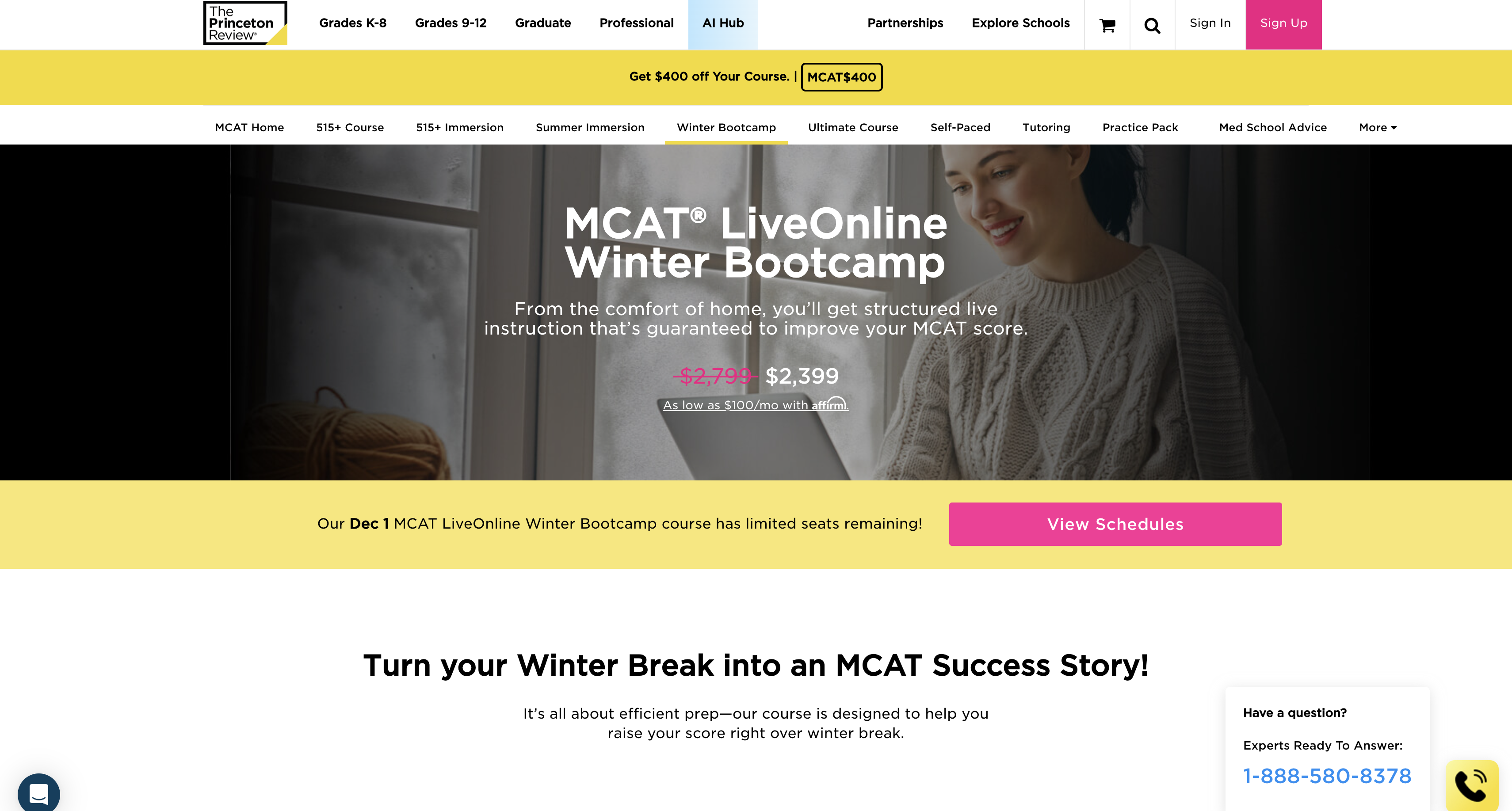 The Princeton Review offers various MCAT test prep courses, the most notable being its Winter Bootcamp. This course is a unique solution for students seeking a focused, short-term burst of preparation before the January testing cycle. With 16 comprehensive classes covering all MCAT sections, diagnostic quizzes, full-length tests, and single-subject tests, it offers an efficient and highly structured path to readiness in just a few weeks.