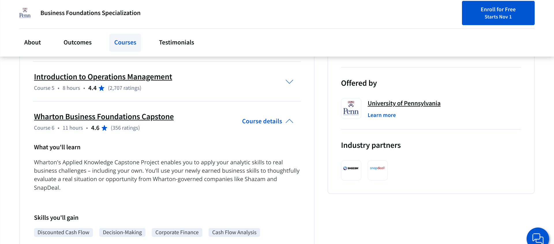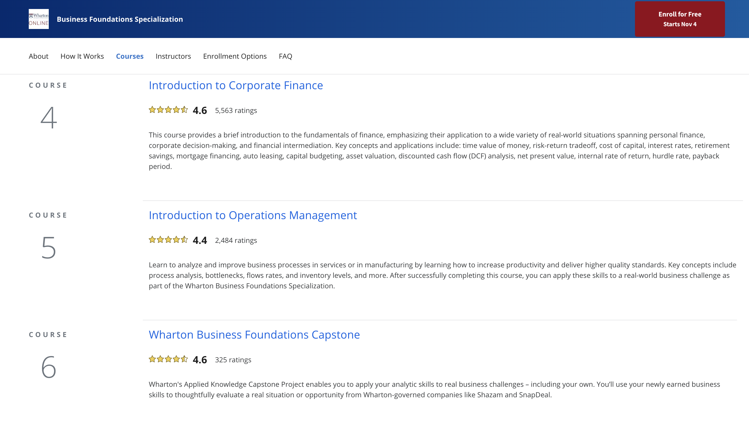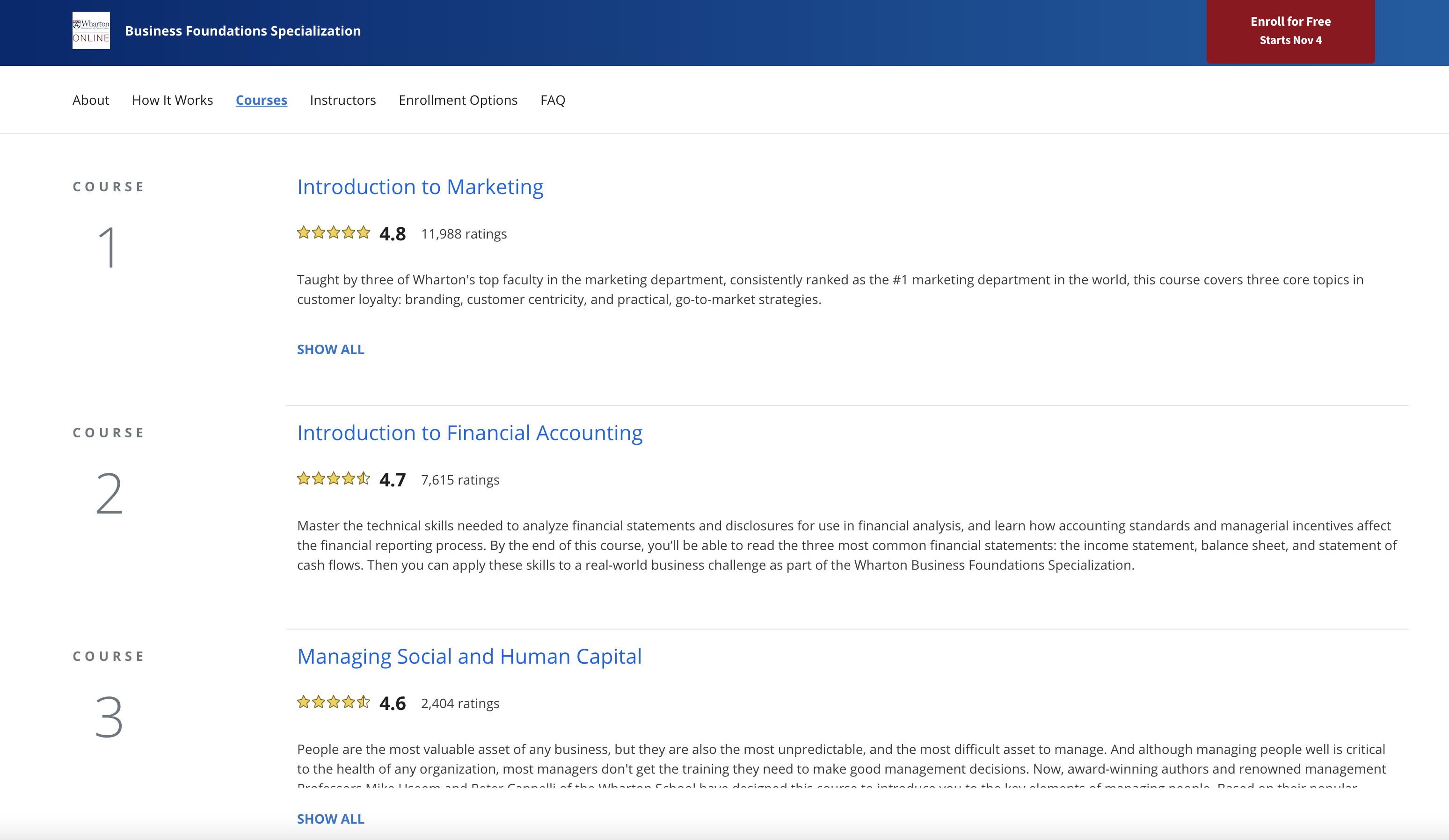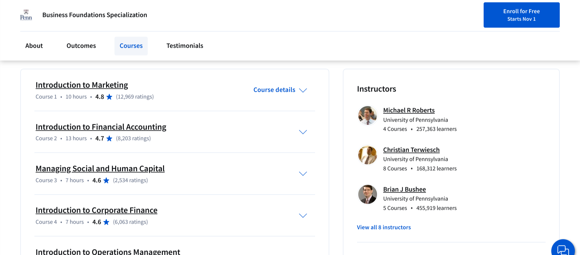 The Business Foundations Specialization course gives students worldwide access to Ivy League-caliber business education without the Ivy League price tag. The specialization consists of six classes: Introduction to Marketing, Introduction to Financial Accounting, Managing Social and Human Capital, Introduction to Corporate Finance, Introduction to Operations Management, and a capstone project.