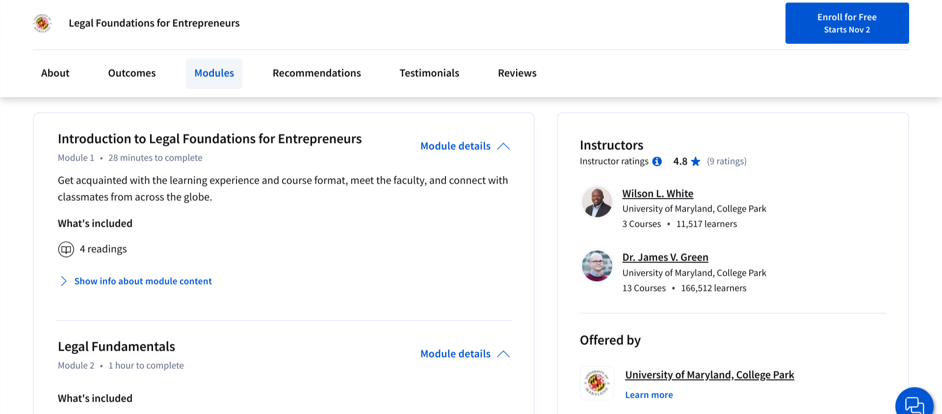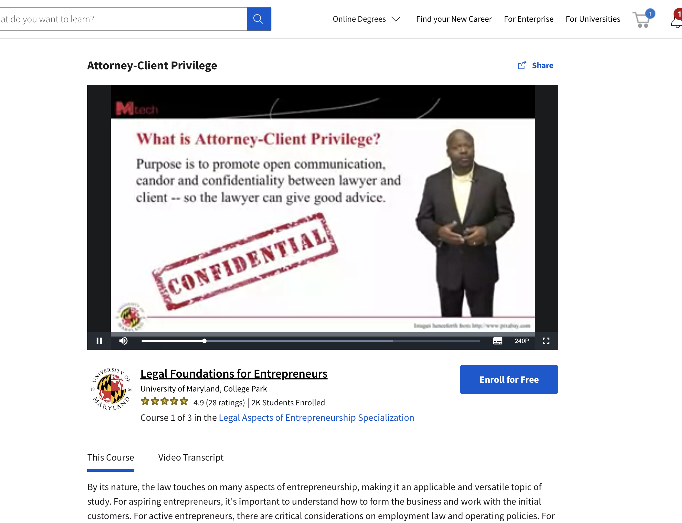 - Legal Foundations for Entrepreneurs – University of Maryland via Coursera – Best Business Law Course