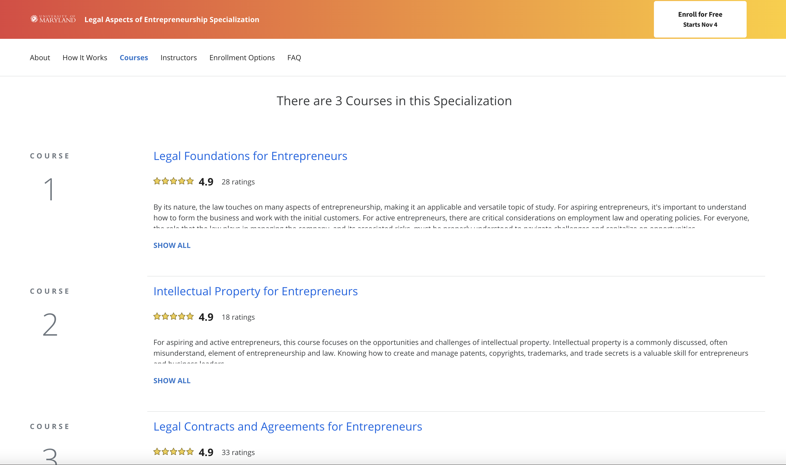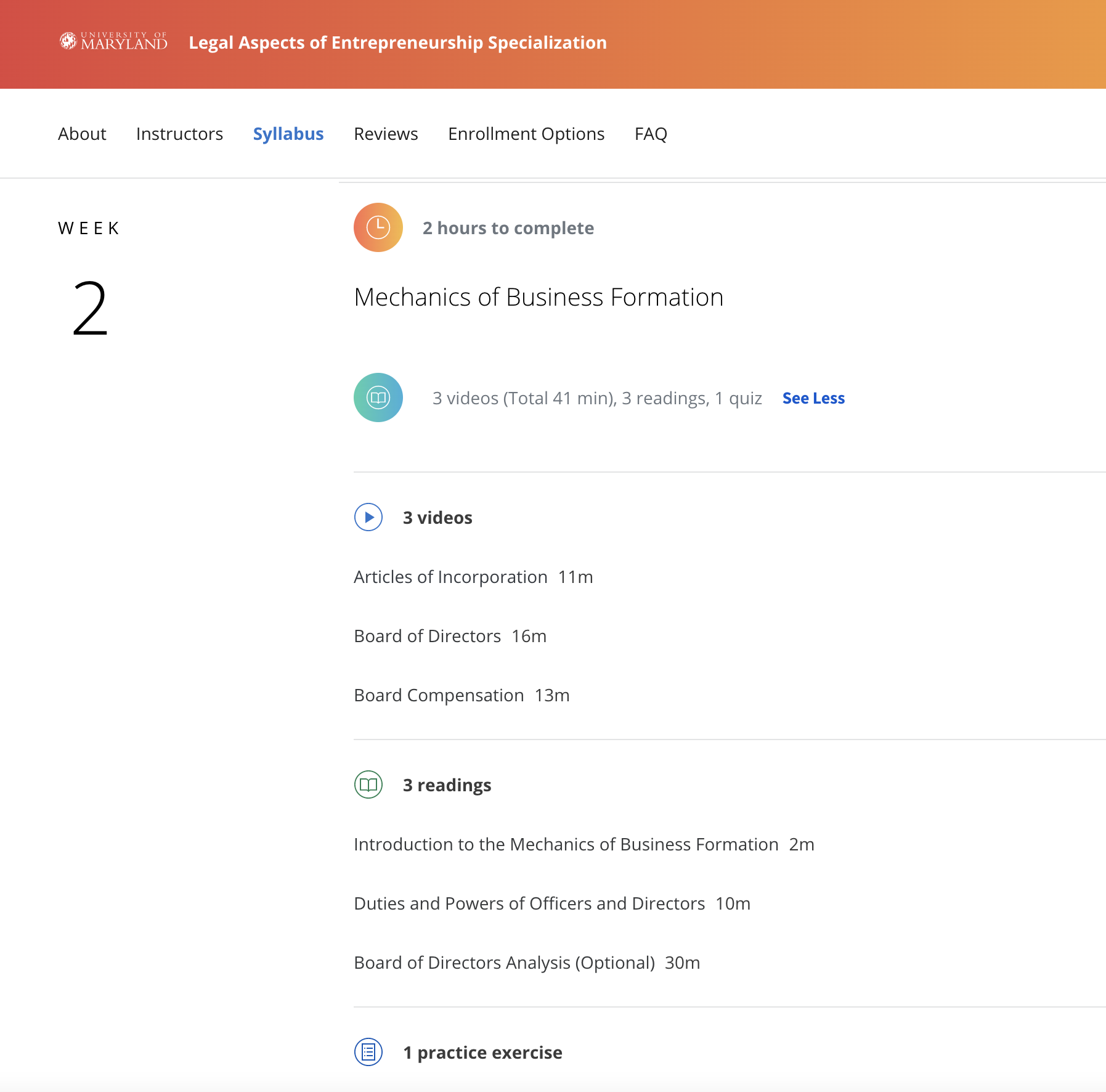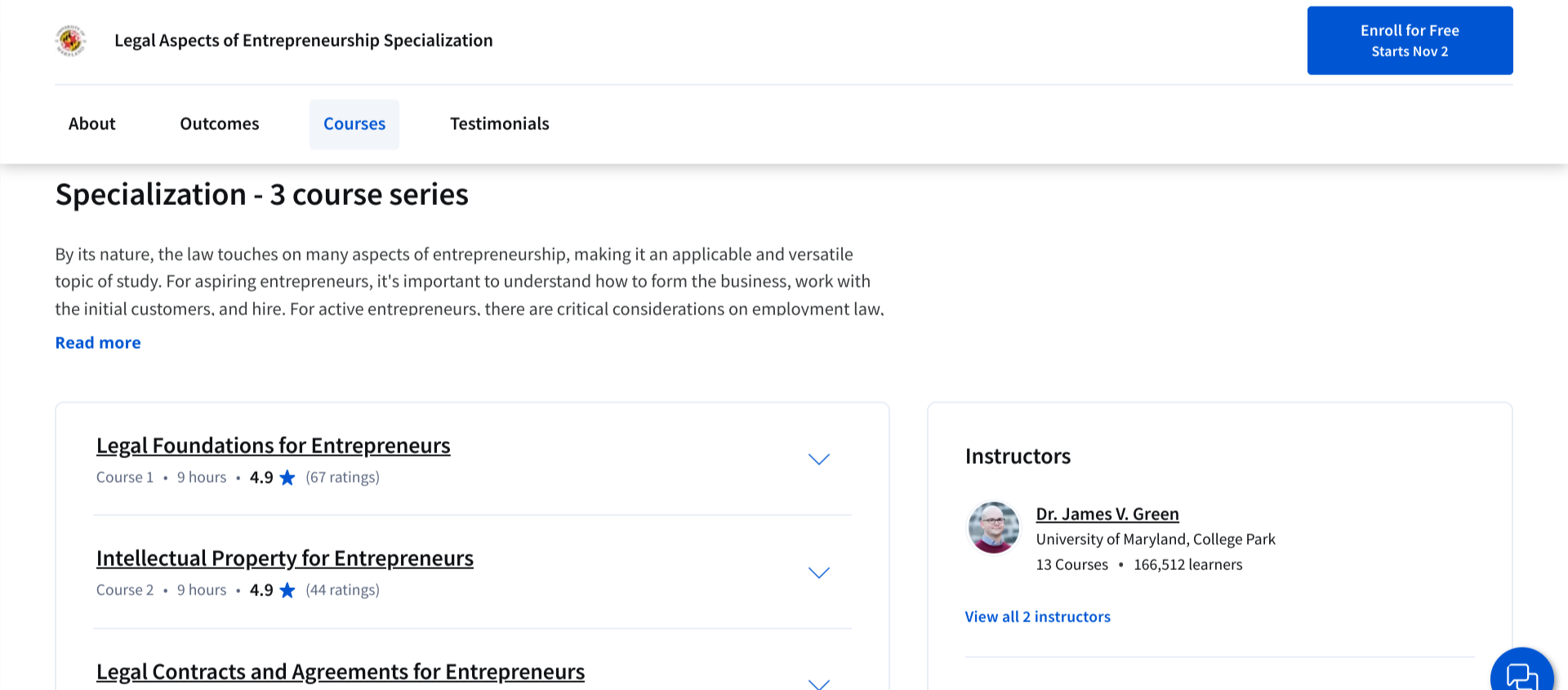 We also like that this course is part of a larger specialization, which includes two other courses. Students who want a deeper understanding of business law for entrepreneurs can apply this course to their specialization.