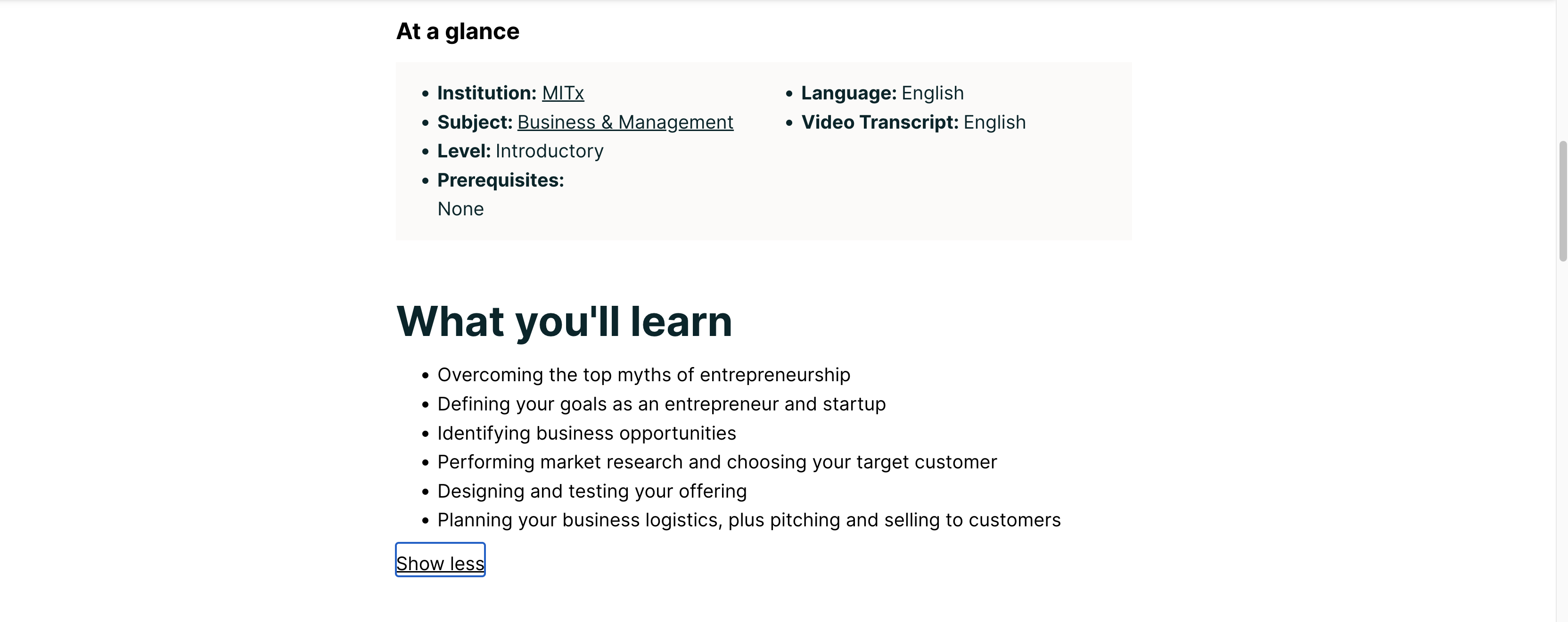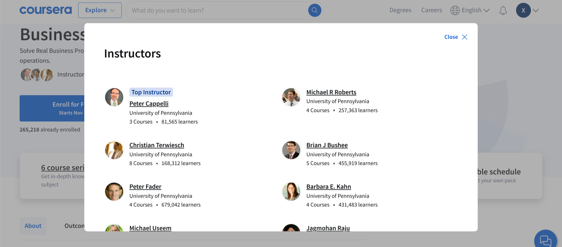Who you’re learning from matters, so we also considered the school or organization offering the courses we evaluated. Many of the online business courses on our list are taught by faculty from renowned higher education institutions like Wharton School of Business, Yale University, and Massachusetts Institute of Technology (MIT). Others, like the Key Technologies for Business specialization, are taught by experts from industry-leading organizations like IBM, ensuring that students can access the most up-to-date information from leaders in their fields.
