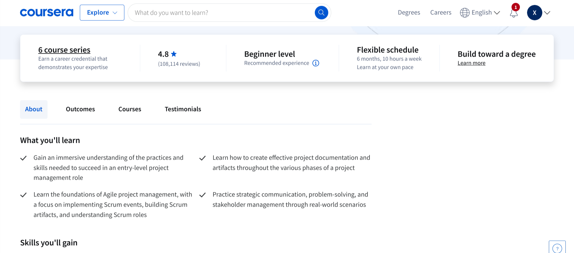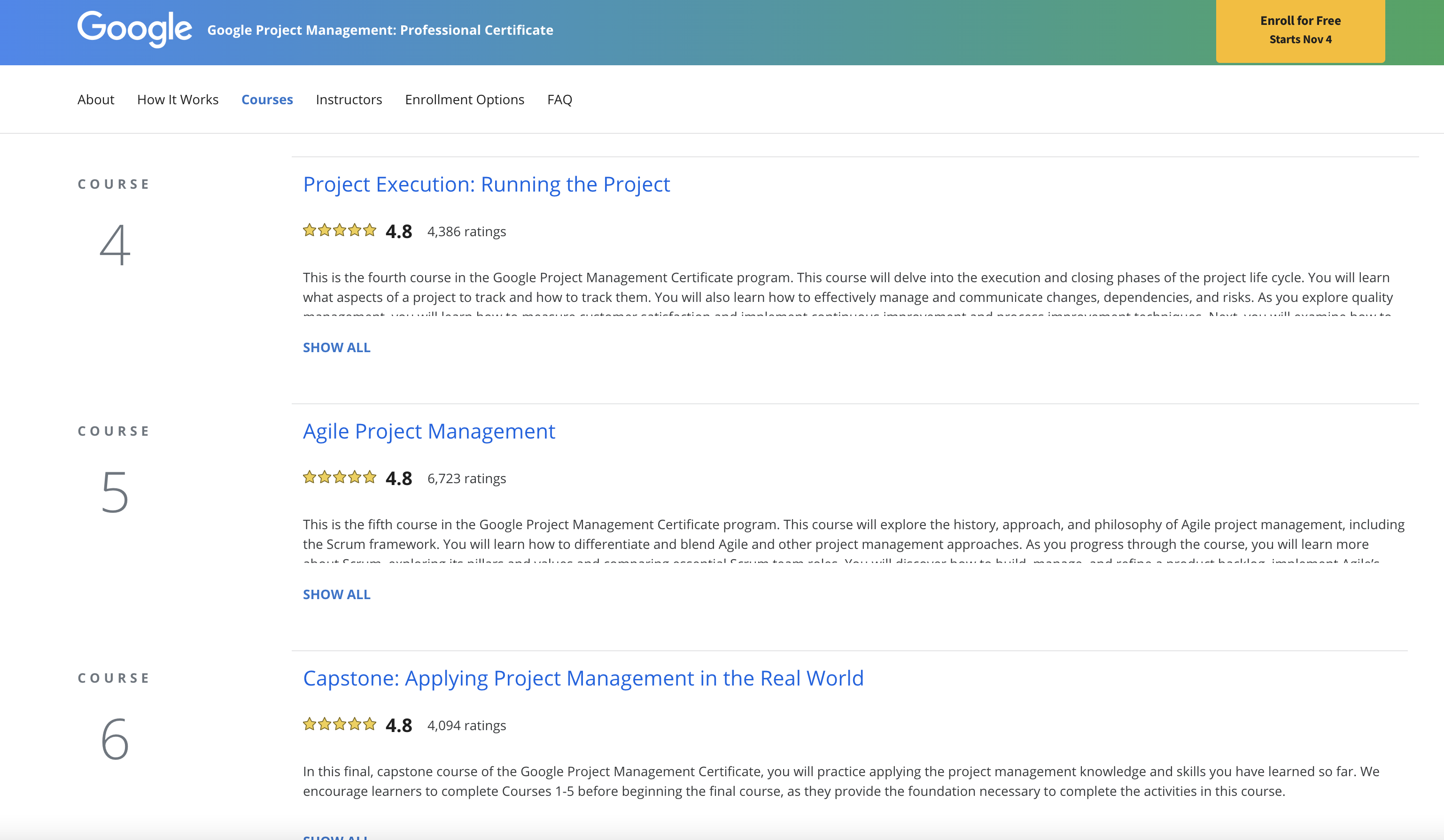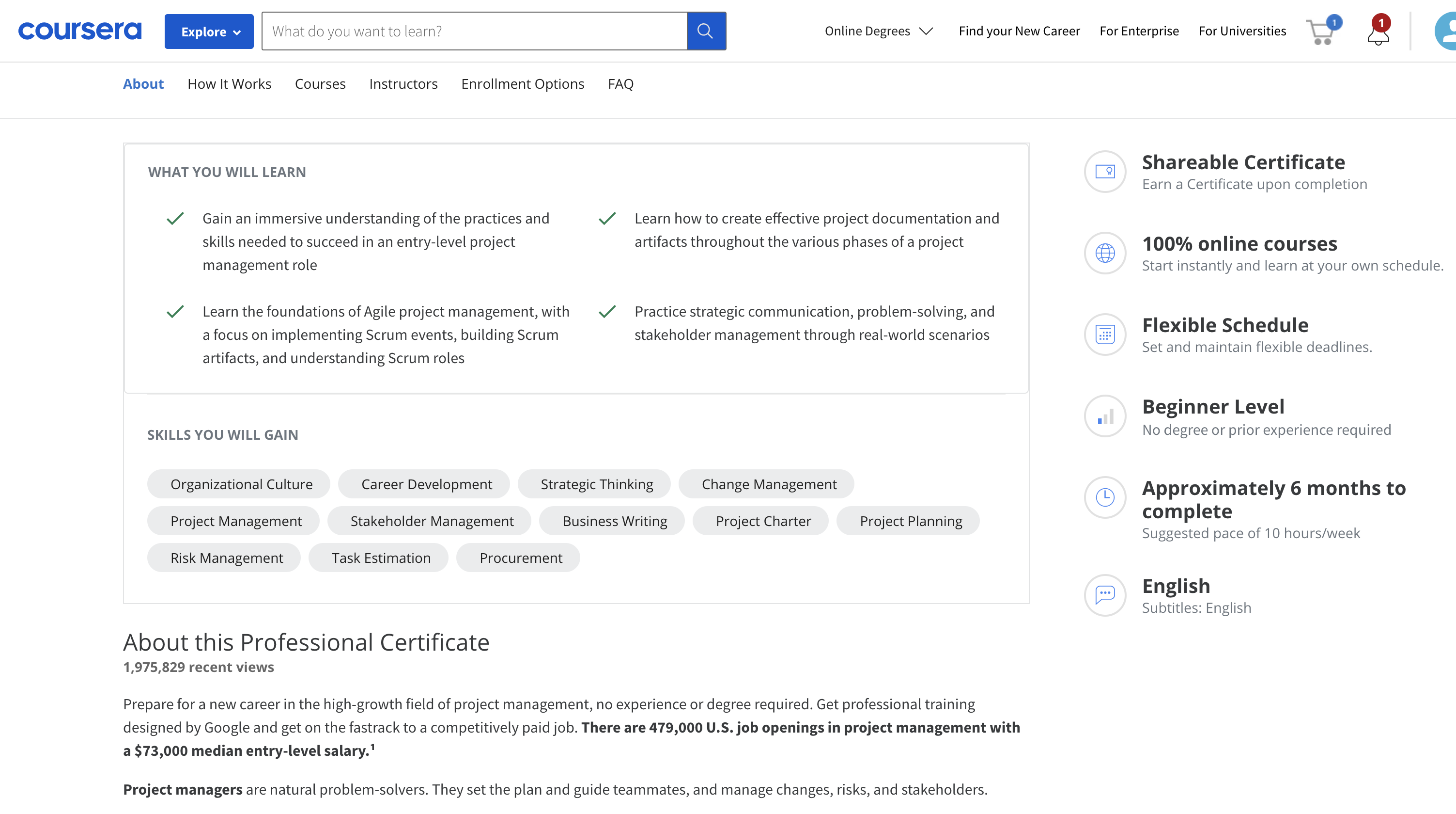 The Google Project Management: Professional Certificate course has an average rating of 4.8 stars from f 100,000+ reviews on Coursera. The Coursera platform has 1.7 stars on Trustpilot.