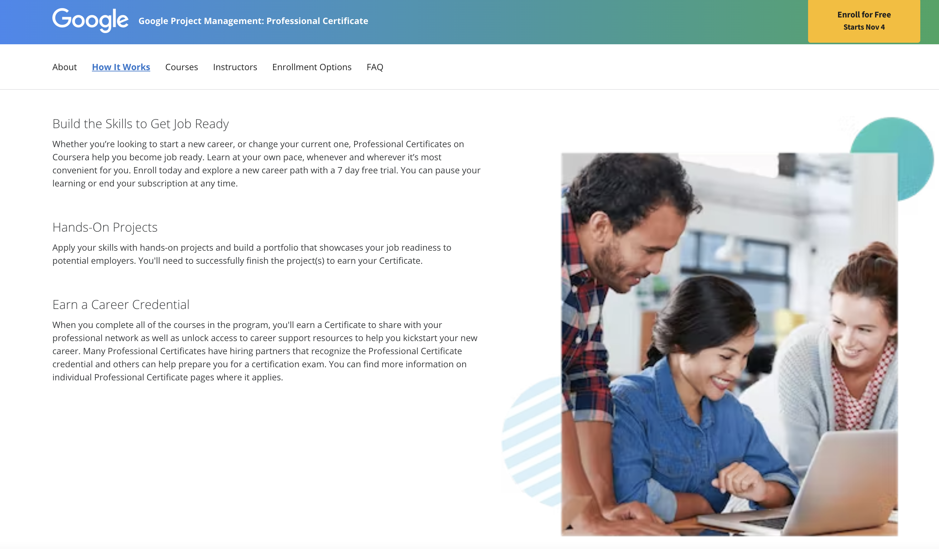 Google’s Project Management Certificate program features a comprehensive curriculum that gives students an immersive understanding of the key practices and skills they need to obtain an entry-level project management position.