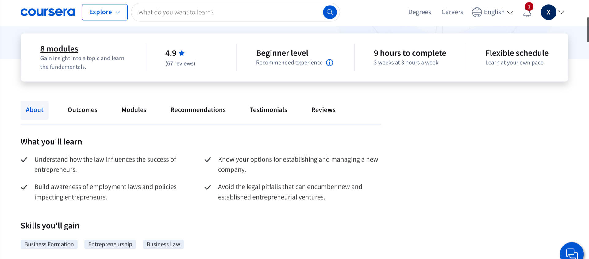 The Legal Foundations for Entrepreneurs course has 4.9 stars on Coursera, with 67 ratings. The Coursera platform has 1.7 stars on Trustpilot. Users like that the platform gives them access to high-quality instruction from top institutions. The most common negative comments for Coursera focus on their customer service.