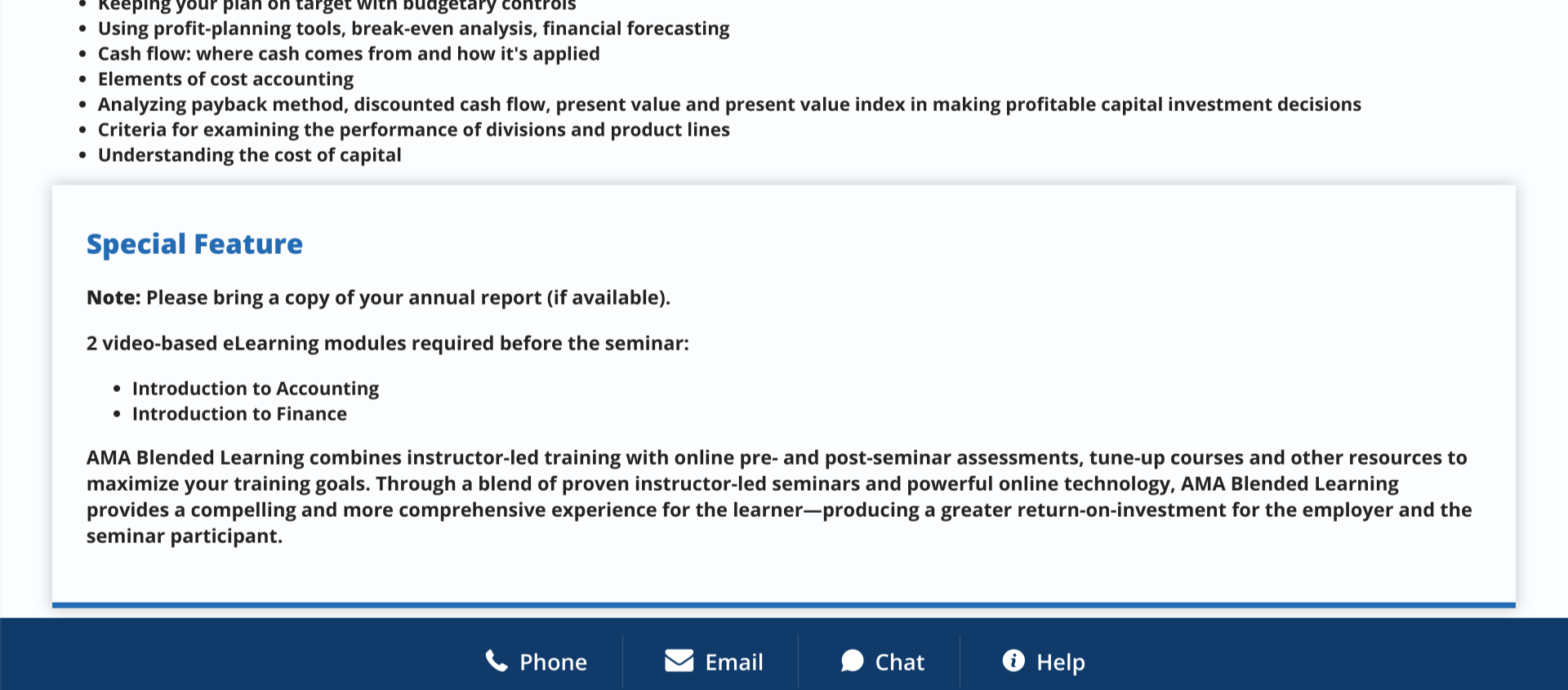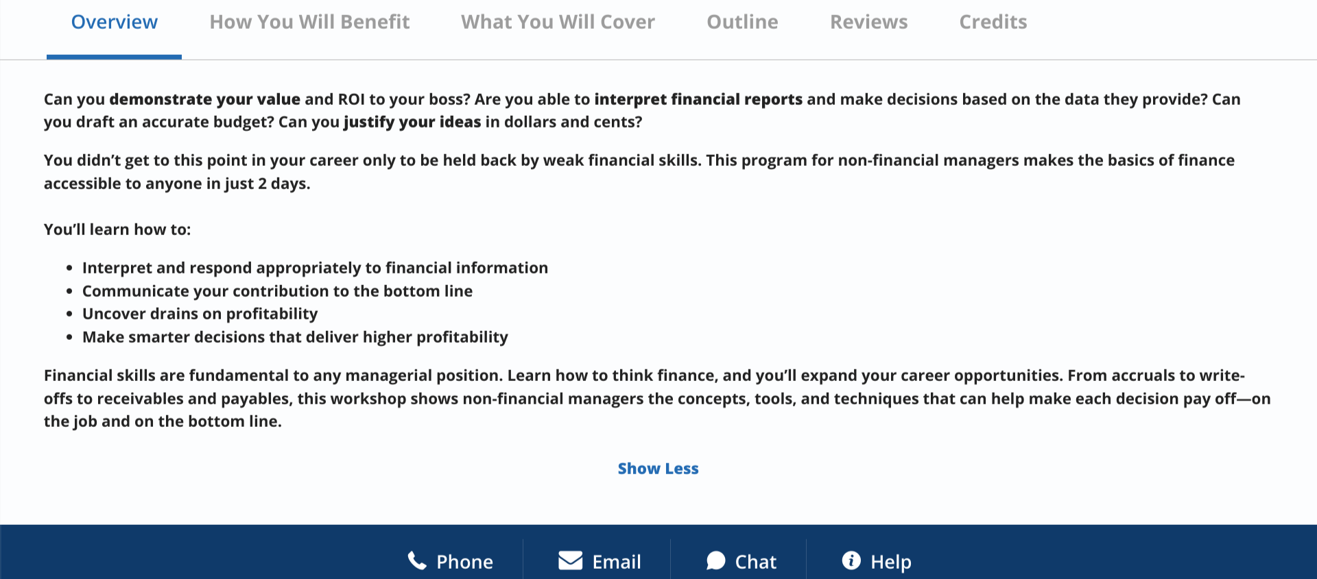 The cost of AMA’s Fundamentals of Finance and Accounting for Non-Financial Managers is $2,345 for AMA members and $2,595 for non-members. This makes it one of the most expensive courses on our list and potentially puts it out of financial reach for some students. The live instruction component also means it’s less flexible than some other courses on our list.