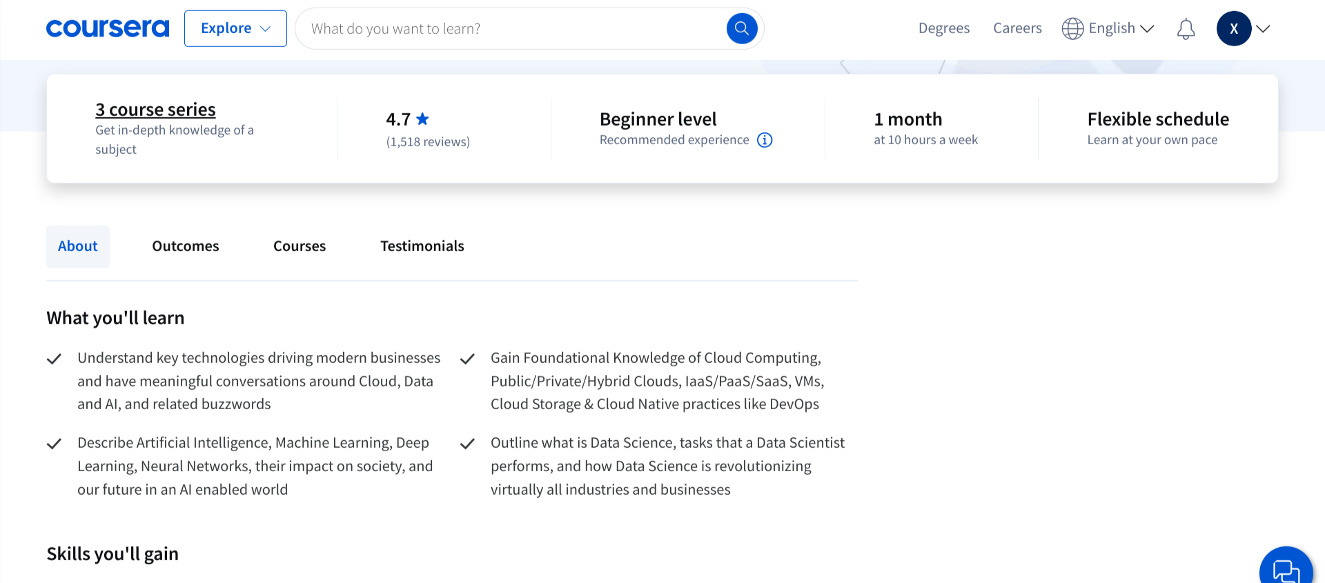 IBM’s Key Technologies for Business Specialization course has 4.7 stars with 1,500+ ratings on Coursera. Overall, the Coursera platform has 1.7 stars on Trustpilot. Student testimonials on Coursera praise this course for helping them gain confidence, develop problem-solving skills, and prepare to launch their own businesses.