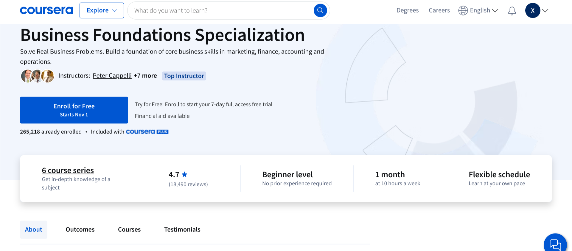 - Business Foundations Specialization – Wharton School of Business via Coursera – Best Overall