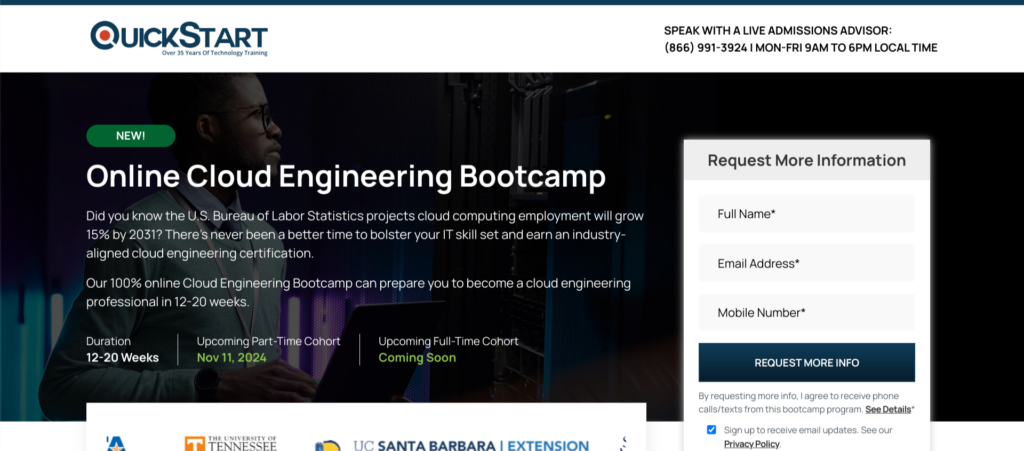 QuickStart’s online cloud computing bootcamp is designed to accommodate college students and allow them to continue their studies while participating in the course. QuickStart partners with several universities for its cloud computing bootcamps, including Hofstra University, UC Santa Barbara, and the University of Texas at Arlington. Students can choose which university to take the bootcamp through, and upon graduation, students will receive a certificate from their chosen university. The course does not require any prerequisites and is designed to prepare students for positions as cloud architects, managers, or engineers. Graduates will receive dedicated career coaching and counseling to help them during their job search.