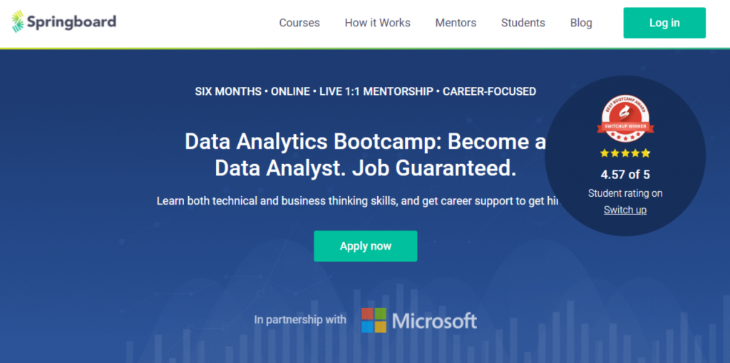 Springboard has partnered with Microsoft to develop one of the most thorough data analysis bootcamps available. The topics covered include structured thinking, breaking down problems into bite-sized chunks that can be tested, analyzing business problems, connecting data using SQL, visualizing your data, and presenting your analysis. Indeed, you’ll learn everything you need to know to work in the data analysis industry.