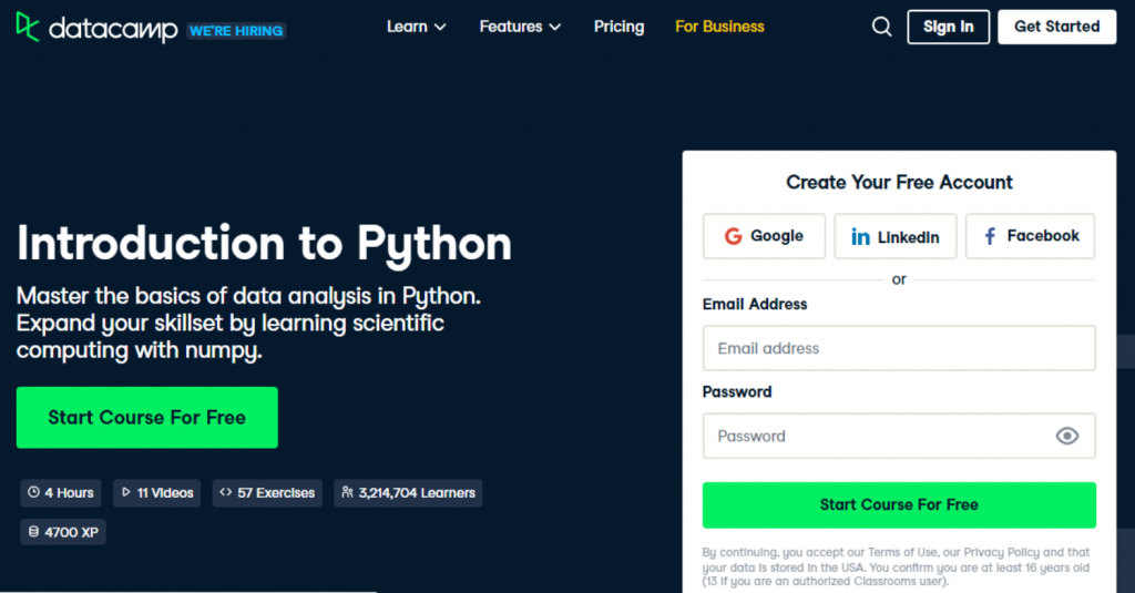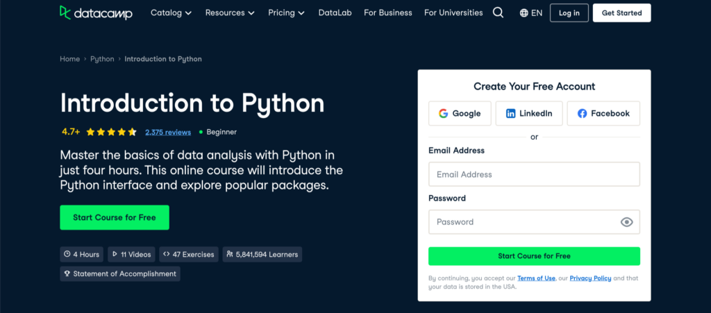 | DataCamp — Introduction to Python — Best for Python | $42 per month or $324 per year | ✓ No prerequisites required