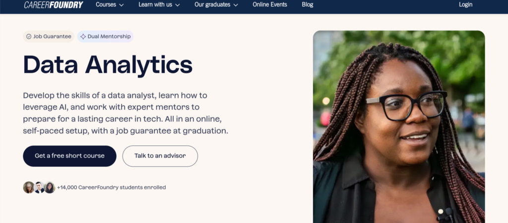 CareerFoundry’s Data Analytics Program ensures that each student gets much personal attention. You’ll be assigned a mentor with over five years of industry experience, and you’ll also get access to a tutor for day-to-day feedback. Beyond teaching you the data analysis skills that you’ll need to work in the industry, CareerFoundry will also show you how to attain a high-paying job. Their career services team will provide you with tailored advice for building your portfolio and improving your interview technique — and if you don’t land a data analyst job within 6 months of graduating from this course, you’ll get all your money back.
