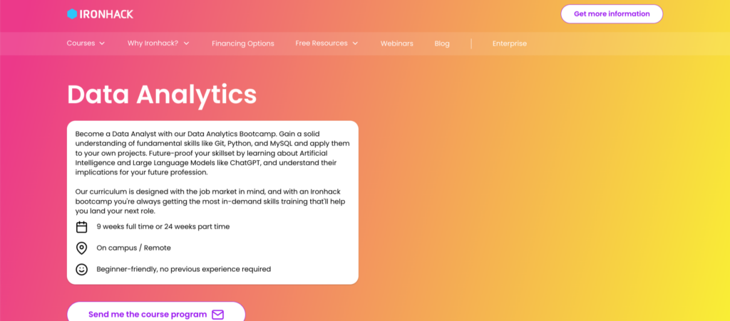 | Ironhack — Data Analytics Bootcamp — Best for Machine Learning | €8,000 | ✓ No prerequisites required