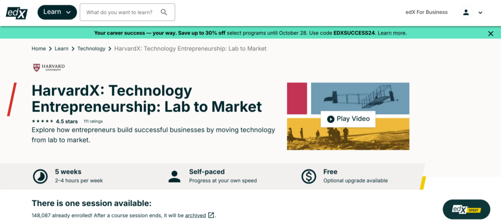 | Harvard University — Technology Entrepreneurship — Best for the Tech Sector | Free; add a verified certificate for $149 | ✓ No prerequisites required