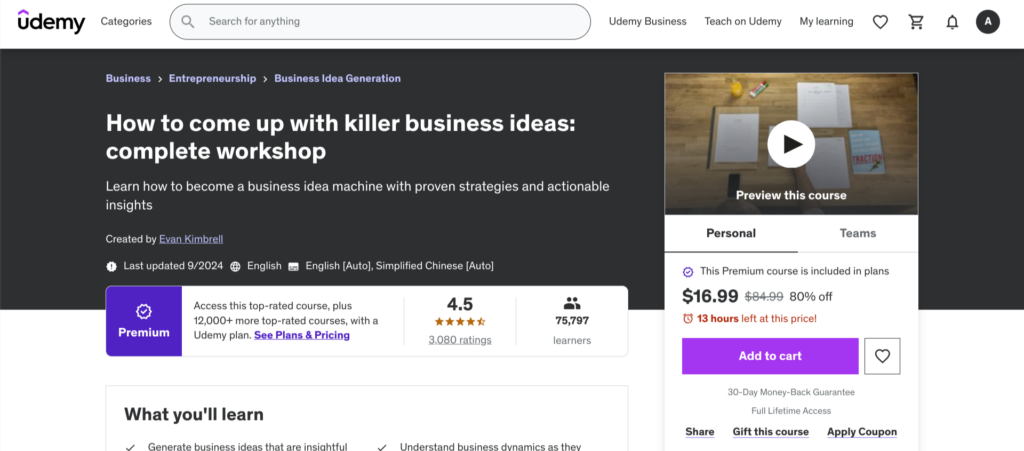 | Udemy — How to Come up With Killer Business Ideas — Best for Generating Ideas | $84.99 | ✓ No prerequisites required