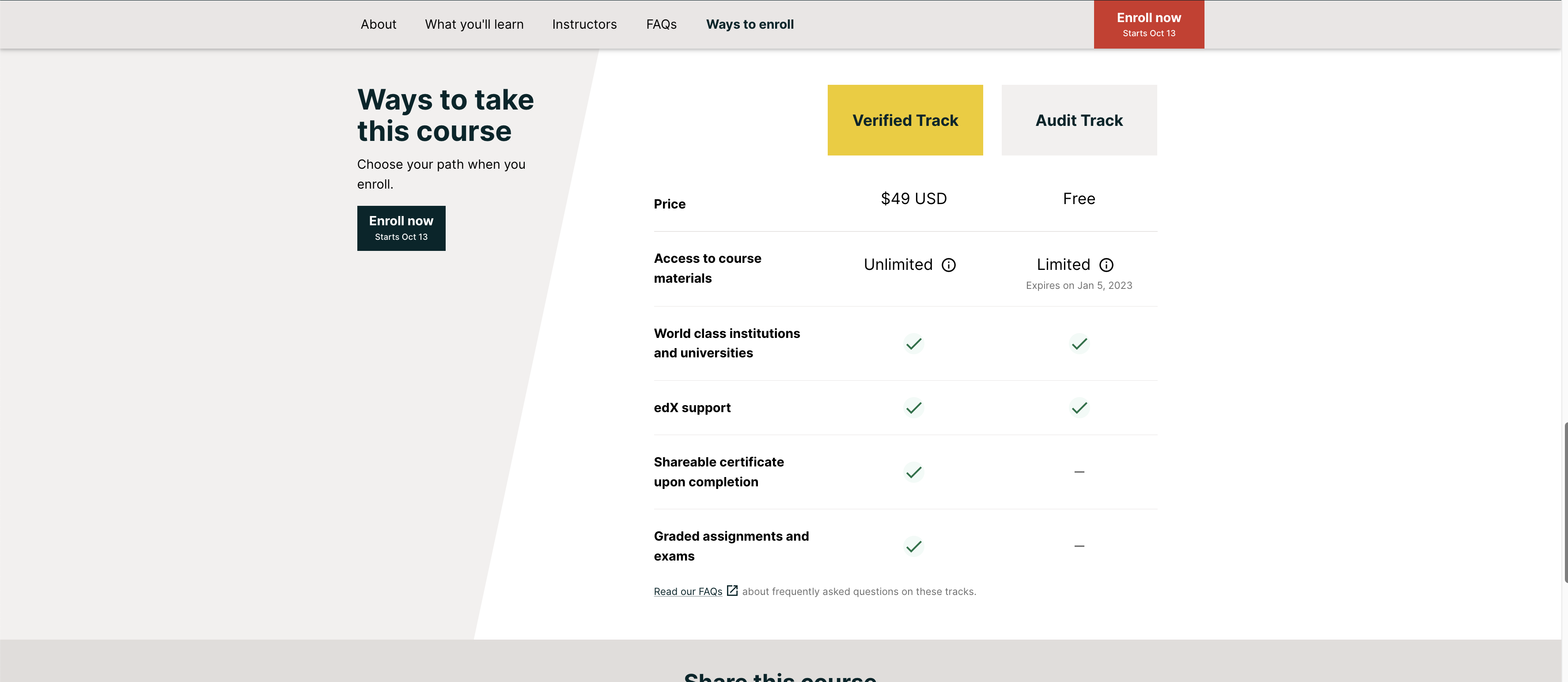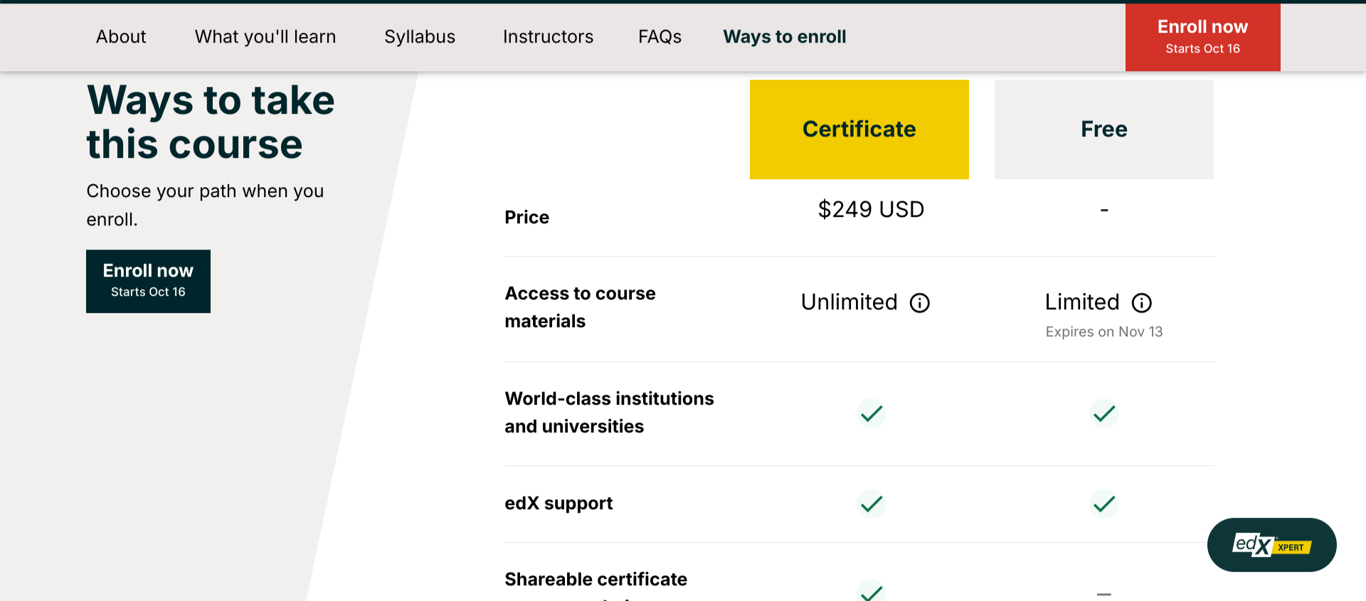 EdX’s platform is user-friendly and intuitive. It’s easy to create an account and instantly enroll in courses, which start on a rolling basis. Before enrolling, students can see the course level, what prerequisites, if any, are required, and the course’s learning objectives.