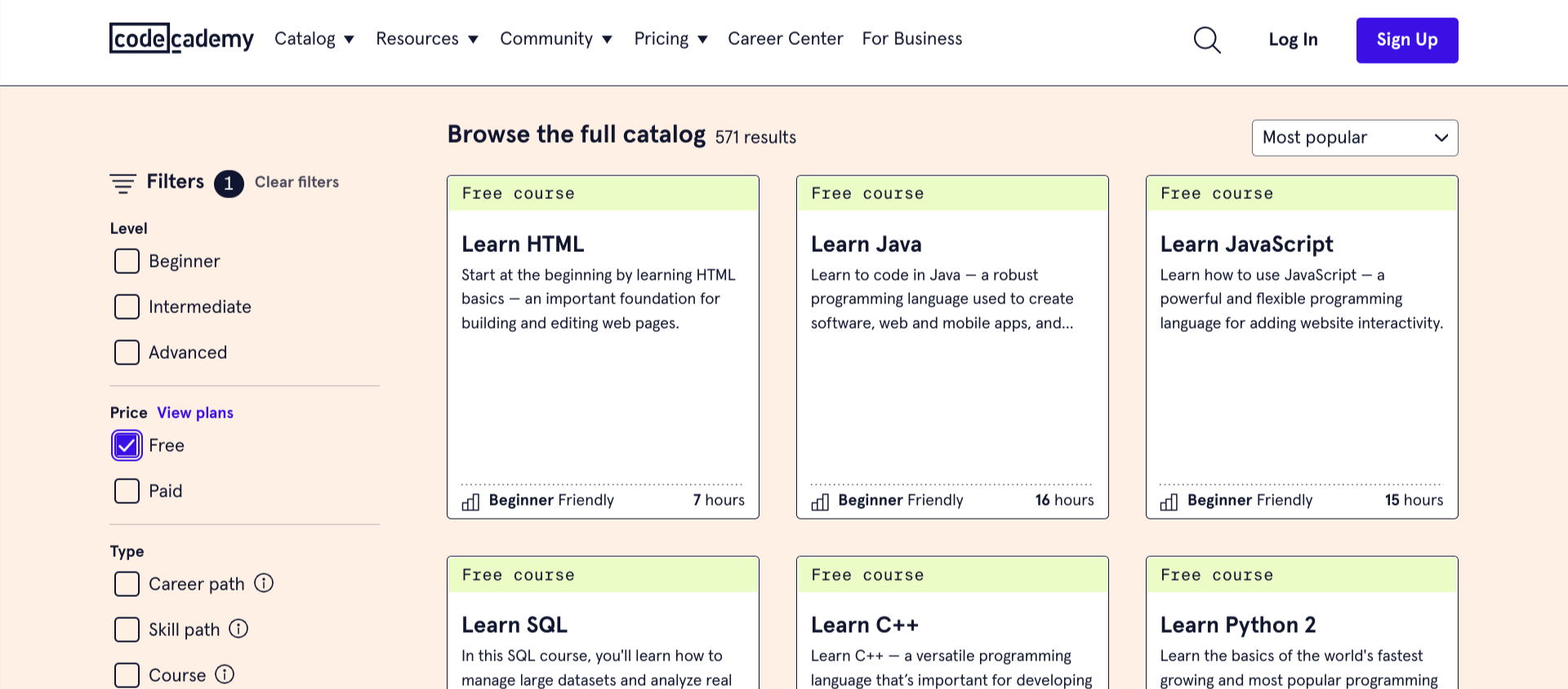 As its name implies, Codecademy’s classes focus specifically on computer programming languages and skills. They offer beginner and advanced courses in popular coding languages, including HTML, Java, Python, SQL, C++, and more. Codecademy’s catalog is easy to navigate and enables students to search courses by specific language, subject, and skill level to easily find what they’re looking for.