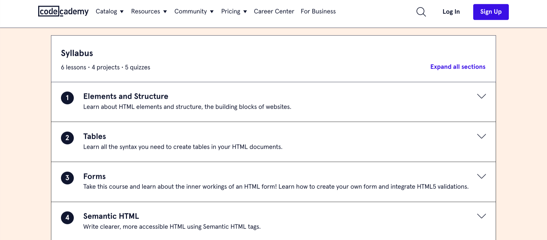 Codecademy’s lessons are delivered on-demand, so as soon as a student creates an account, they can enroll in a course and start coding. Course descriptions include a syllabus, the number of hours a course takes to complete, and whether there are any prerequisite skills students should have before enrolling. We like that Codecademy’s classes take anywhere from 1-30 hours to complete, making them convenient for busy students who might not have time to devote to studying. Skills are taught through reading assignments and hands-on practice, all within Codecademy’s platform.
