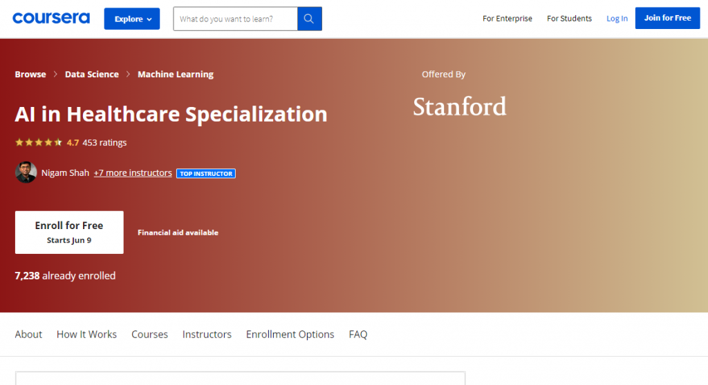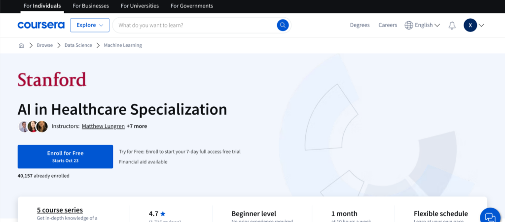 | Coursera — AI in Healthcare Specialization by Stanford University — Most Advanced | $79 per month | ✓ No prerequisites required