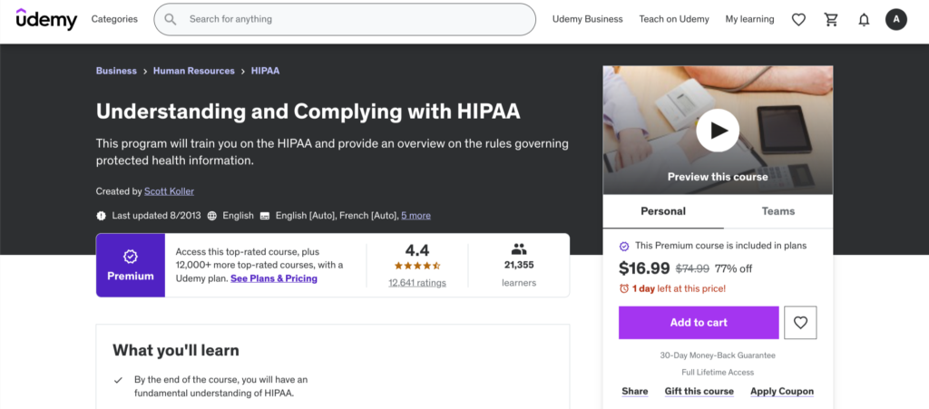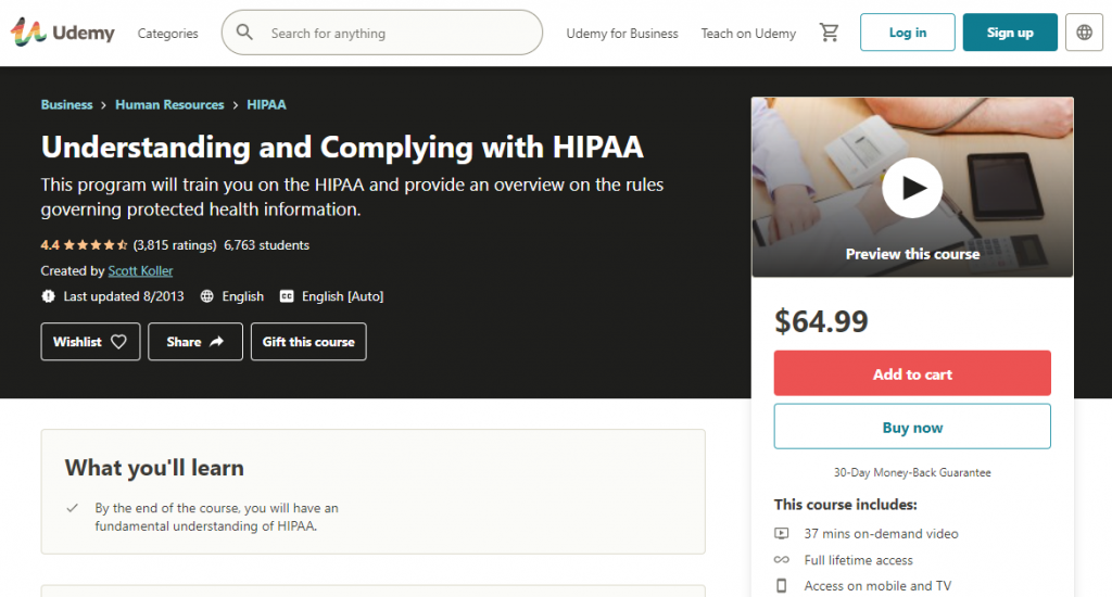 | Udemy — Understanding and Complying with HIPAA — Shortest Course | $74.99 | ✓ No prerequisites required