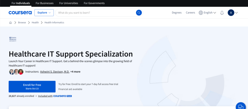 | Coursera — Healthcare IT Support Specialization by Johns Hopkins University — Best Professional Outcomes | $49 per month | ✓ No prerequisites required