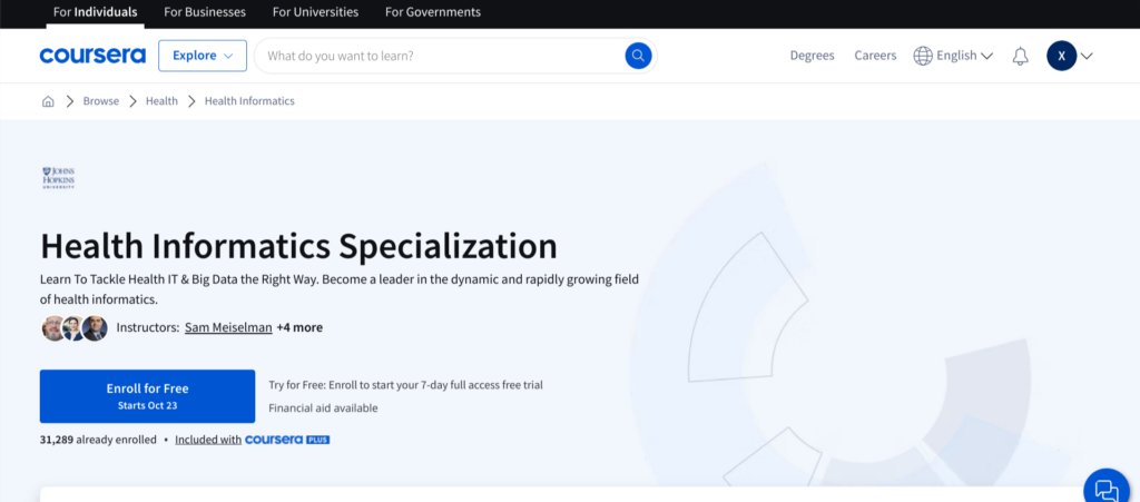 - Coursera — Health Informatics Specialization by Johns Hopkins University — Top Pick