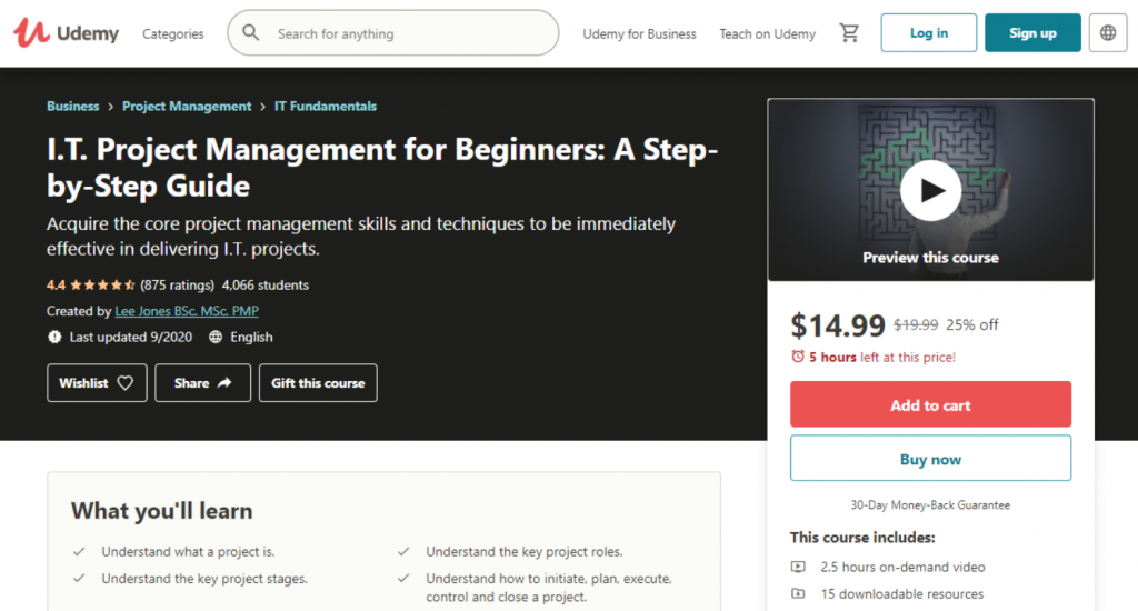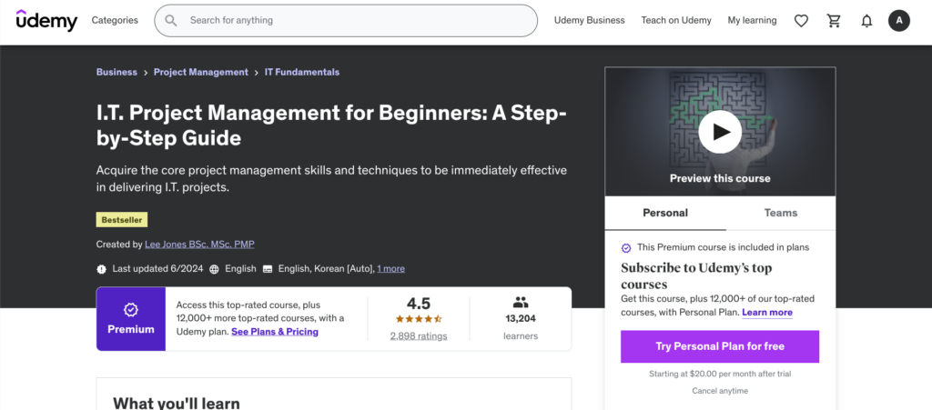 | Udemy — I.T. Project Management for Beginners: A Step-by-Step Guide — Best for Beginners | $94.99 | ✓ No prerequisites required