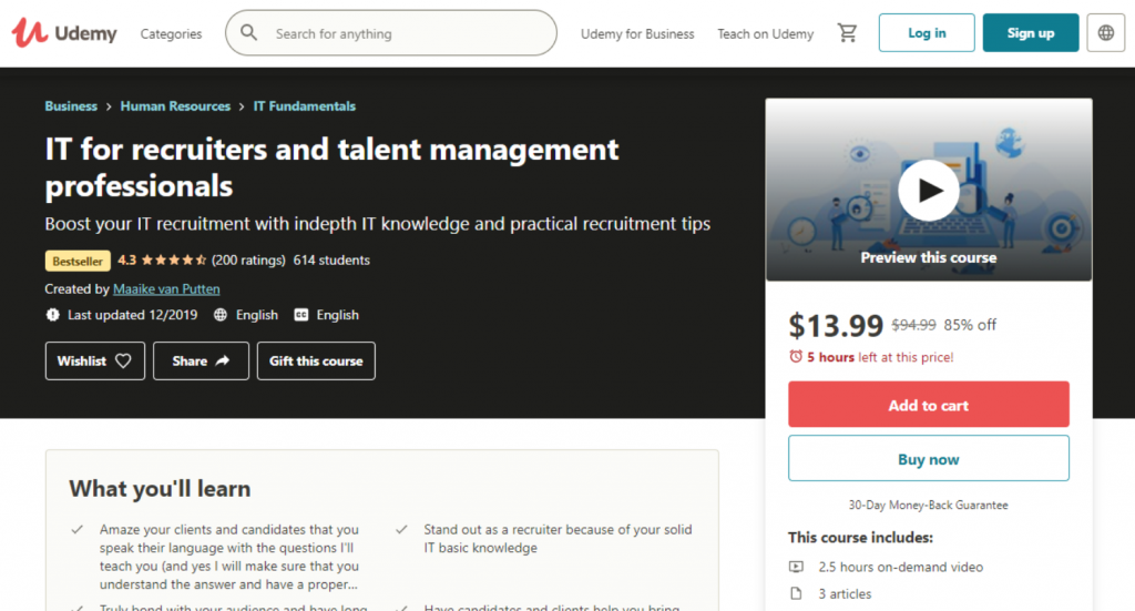 | Udemy — IT for Recruiters and Talent Management Professionals — Best for Non-IT Professionals | $64.99 | ✓ No prerequisites required