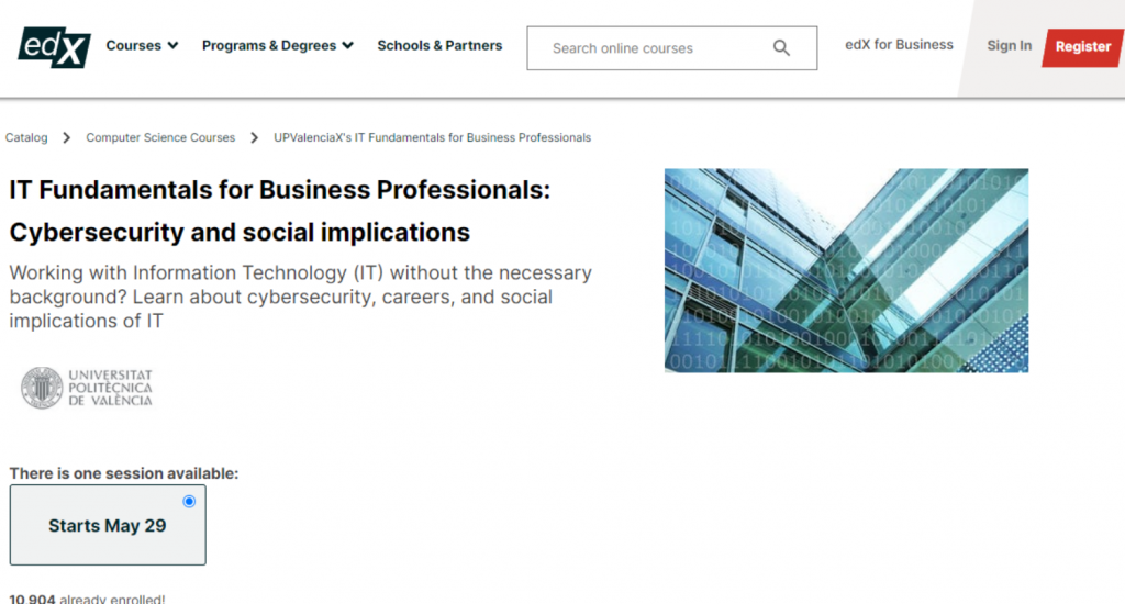 | edX — IT Fundamentals for Business Professionals: Cybersecurity and Social Implications — Best for Exam Prep | Free (Add a Verified Certificate for $69) | X No prerequisites required