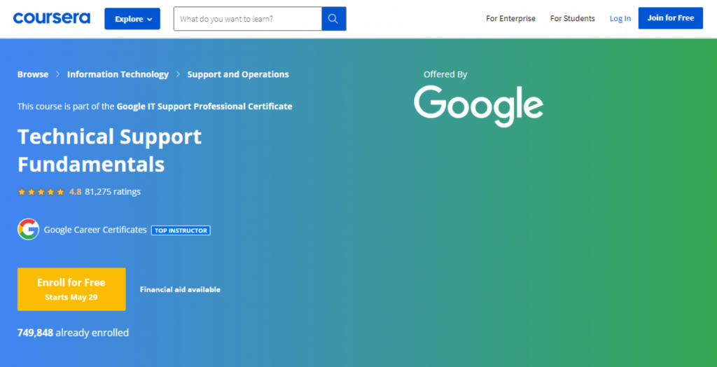 - Coursera — Technical Support Fundamentals — Best for Professional Outcomes