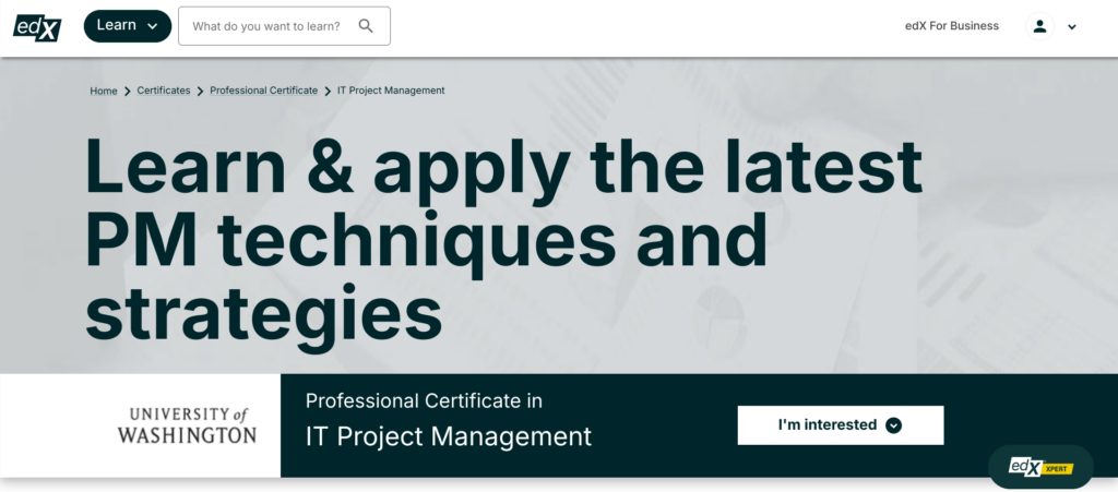| edX — UWashingtonX’s IT Project Management — Top Pick | $747 | ✓ No prerequisites required
